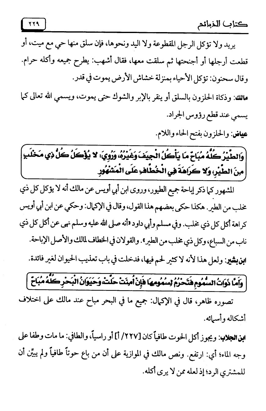 مالك: وذكاة الحلزون بالسلق أو ينقر بالإبر والشوك حتى يموت، ويسمي الله تعالى كما يسمي عند قطع رؤوس الجراد.