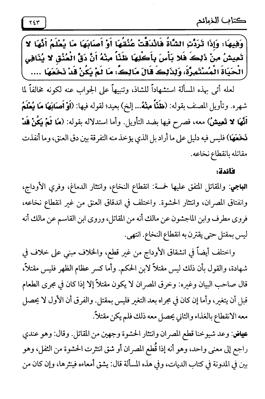 وَفِيهَا: وَإِذَا تَرَدَّتِ الشَّاةُ فَانْدَقَّتْ عُنُقُهَا أَوْ أَصَابَهَا مَا يُعْلَمُ أَنَّهَا لا تَعِيشُ مِنْ ذَلِكَ فَلا بَأسَ بأَكْلِهَا ظَنّاً مِنْهُ أَنَّ دَقَّ الْعُنُقِ لا يُنَافِي الْحَيَاةَ الْمُسْتَمِرَّةَ، وَلِذَلِكَ قَالَ مَالِكٌ: مَا لَمْ يَكُنْ قَدْ نَخَعَهَا ...