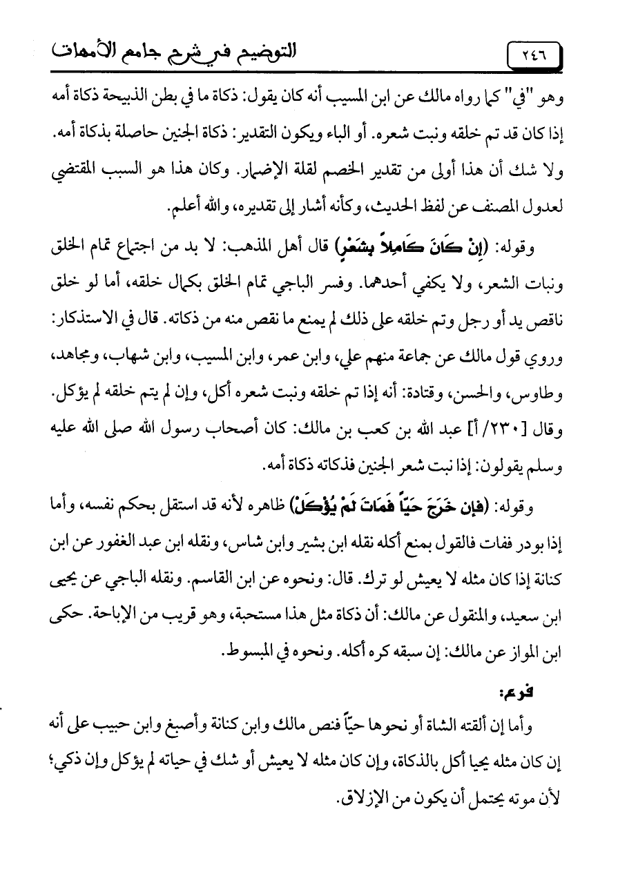 وقوله: (إِنْ كَانَ كَامِلاً بشَعْرٍ) قال أهل المذهب: لابد من اجتماع تمام الخلق ونبات الشعر، ولا يكفي أحدهما. وفسر الباجي تمام الخلق بكمال خلقه، أما لو خلق ناقص يد أو رجل وتم خلقه على ذلك لم يمنع ما نقص منه من ذكاته. قال في الاستذكار: وروي قول مالك عن جماعة منهم علي، وابن عمر، وابن المسيب، وابن شهاب، ومجاهد، وطاوس، والحسن، وقتادة: أنه إذا تم خلقه ونبت شعره أكل، وإن لم يتم خلقه لم يؤكل. وقال [230/أ] عبد الله بن كعب بن مالك: كان أصحاب رسول الله صلى الله عليه وسلم يقولون: إذا نبت شعر الجنين فذكاته ذكاة أمه.