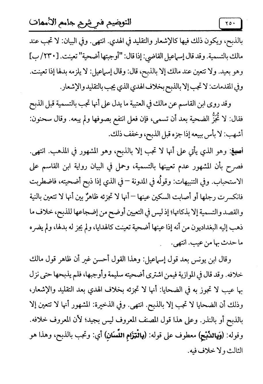 بالذبح، ويكون ذلك فيها كالإشعار والتقليد في الهدي. انتهى. وفي البيان: لا تجب عند مالك بالتسمية. وقد قال إسماعيل القاضي: إذا قال: "أوجبتها أضحية" تعينت. [230/ب] وهو بعيد. ولا تتعين عند مالك إلا بالذبح، قال: وقال إسماعيل: لا يلزمه بدلها إذا تعينت. وفي المقدمات: لاتجب إلا بالذبح بخلاف الهدي الذي يجب بالتقليد والإشعار.