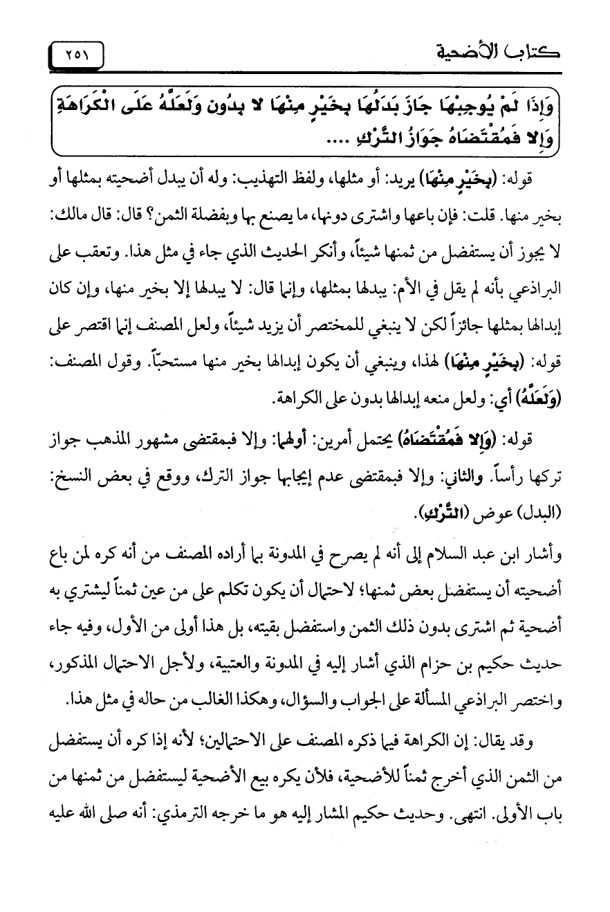 وأشار ابن عبد السلام إلى أنه لم يصرح في المدونة بما أراده المصنف من أنه كره لمن باع أضحيته أن يستفضل بعض ثمنها؛ لاحتمال أن يكون تكلم على من عين ثمناً ليشتري به أضحية ثم اشترى بدون ذلك الثمن واستفضل بقيته، بل هذا أولى من الأول، وفيه جاء حديث حكيم بن حزام الذي أشار إليه في المدونة والعتبية، ولأجل الاحتمال المذكور، واختصر البرادْعي المسألة على الجواب والسؤال، وهكذا الغالب من حاله في مثل هذا.