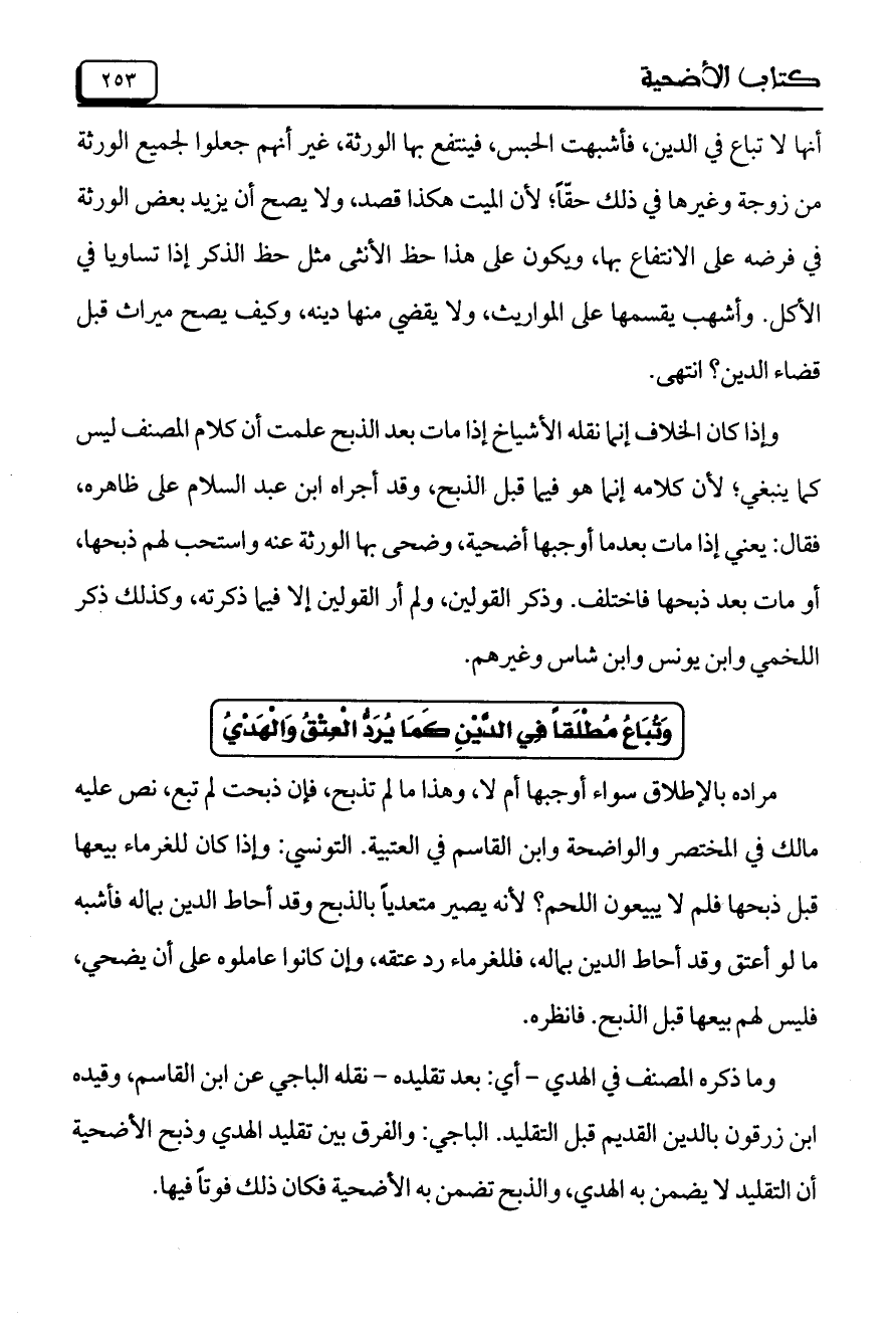 مراده بالإطلاق سواء أوجبها أم لا، وهذا ما لم تذبح، فإن ذبحت لم تبع، نص عليه مالك في المختصر والواضحة وابن القاسم في العتبية. التونسي: وإذا كان للغرماء بيعها قبل ذبحها فلم لا يبيعون اللحم؟ لأنه يصير متعدياً بالذبح وقد أحاط الدين بماله فأشبه ما لو أعتق وقد أحاط الدين بماله، فللغرماء رد عتقه، وإن كانوا عاملوه على أن يضحي، فليس لهم بيعها قبل الذبح. فانظره.