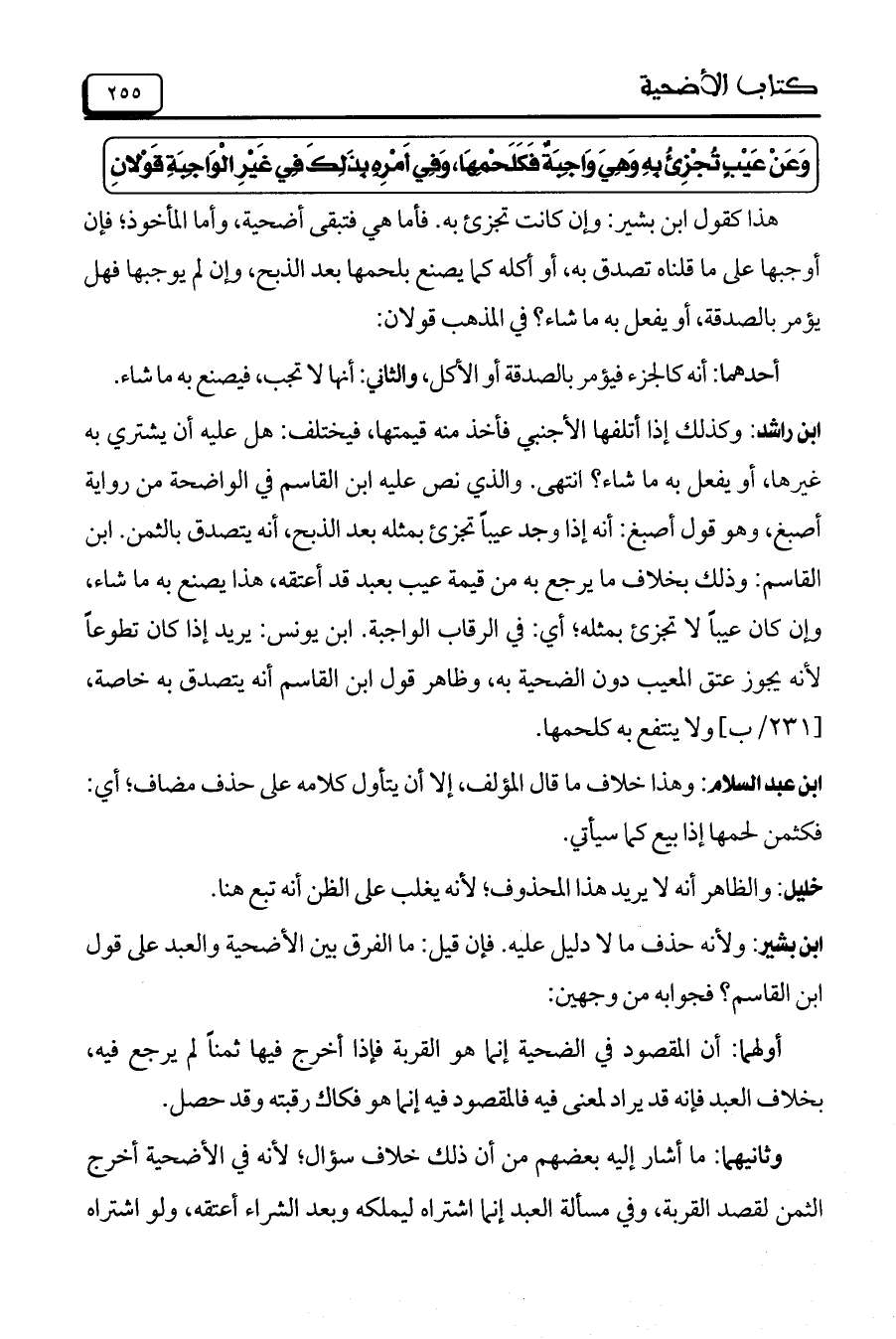 ابن بشير: ولأنه حذف ما لا دليل عليه. فإن قيل: ما الفرق بين الأضحية والعبد على قول ابن القاسم؟ فجوابه من وجهين: