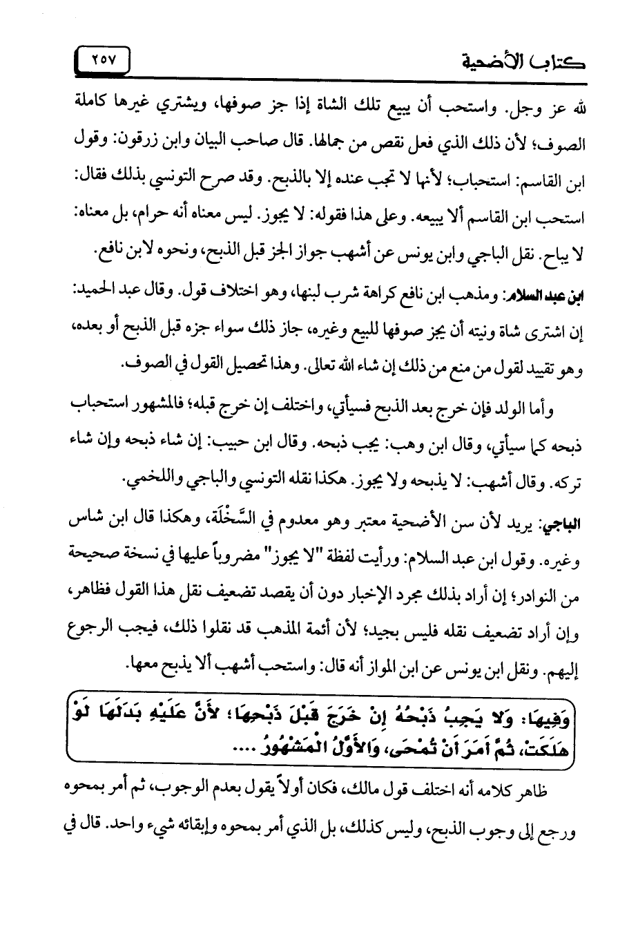 لله عز وجل. واستحب أني بيع تلك الشاة إذا جز صوفها، ويشتري غيرها كاملة الصوف؛ لأن ذلك الذي فعل نقص من جمالها. قال صاحب البيان وابن زرقون: وقول ابن القاسم: استحباب؛ لأنها لا تجب عنده إلا بالذبح. وقد صرح التونسي بذلك فقال: استحب ابن القاسم ألا يبيعه. وعلى هذا فقوله: لا يجوز ليس معناه أنه حرام، بل معناه: لا يباح. نقل الباجي وابن يونس عن أشهب جواز الجز قبل الذبح، ونحوه لابن نافع.