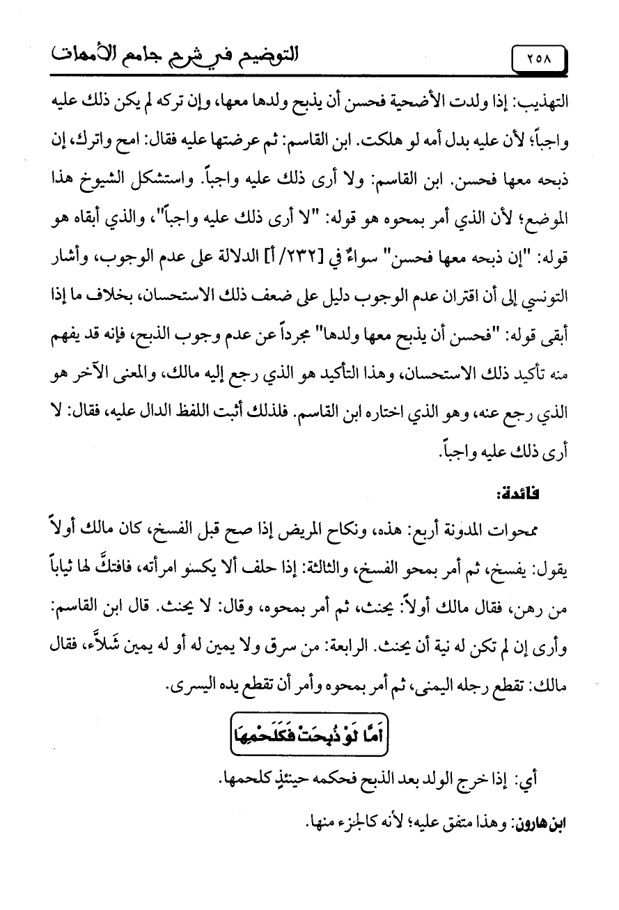 التهذيب: إذا ولدت الأضحية فحسن أن يذبح ولدها معها، وإن تركه لم يكن ذلك عليه واجباً؛ لأن عليه بدل أمه لو هلكت. ابن القاسم: ثم عرضتها عليه فقال: امح واترك، إن ذبحه معها فحسن. ابن القاسم: ولا أرى ذلك عليه واجباً. واستشكل الشيوخ هذا الموضع؛ لأن الذي أمر بمحوه هو قوله: "لا أرى ذلك عليه واجباً"، والذي أبقاه هو قوله: "إن ذبحه معها فحسن" سواءٌ في [232/أ] الدلالة على عدم الوجوب، وأشار التونسي إلى أن اقتران عدم الوجوب دليل على ضعف ذلك الاستحسان، بخلاف ما إذا أبقى قوله: "فحسن أن يذبح معها ولدها" مجرداً عن عدم وجوب الذبح، فإنه قد يفهم منه تأكيد ذلك الاستحسان، وهذا التأكيد هو الذي رجع إليه مالك، والمعنى الآخر هو الذي رجع عنه، وهو الذي اختاره ابن القاسم. فلذلك أثبت اللفظ الدال عليه، فقال: لا أرى ذلك عليه واجباً.