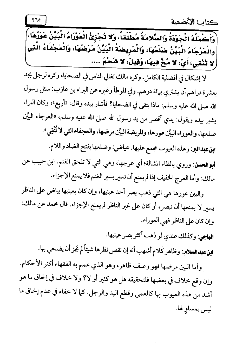 وَأَكْمَلُهُ الْجَوْدَةُ وَالسَّلامَةُ مُطْلَقاً، وَلا تُجْزِئُ الْعَوْرَاءُ الْبَيِّنُ عَوَرُهَا، والْعَرْجَاءُ الْبَيِّنُ ضَلَعُهَا، وَالْمَرِيضَةُ الْبَيِّنُ مَرَضُهَا، وَالْعَجْفَاءُ الْتِي لا تُنْقِي؛ أي: لا مُخٌّ فِيهَا، وَقِيلَ: لا شَحْمَ ....