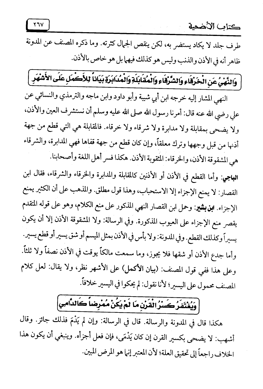 وَالنَّهْيُ عَنِ الْخَرْقَاءِ وَالشَّرْقَاءِ وَالْمُقَابَلَةِ وَالْمُدَابَرَةِ بَيَاناً لِلأكْمَلِ عَلَى الأَشْهَرِ