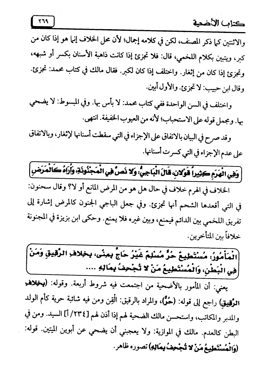 يعني: أن المأمور بالأضحية من اجتمعت فيه شروط أربعة. وقوله: (بِخلافِ الرَّقِيقِ) راجع إلى قوله: (حُرٌّ)، والمراد بالرقيق: الْقِن ومن فيه شائبة حرية كأم الولد والمدبر والمكاتب، واستحسن مالك الضحية لهم إذا أذن لهم [234/أ] السيد. ومن في البطن كالعدم. مالك في الموازية: ولا يعجبني أن يضحي عن أبوين الميتين. قوله: (وَالْمُسْتَطِيعُ مَنْ لا تُجْحِفُ بِمَالِهِ) تصوره ظاهر.