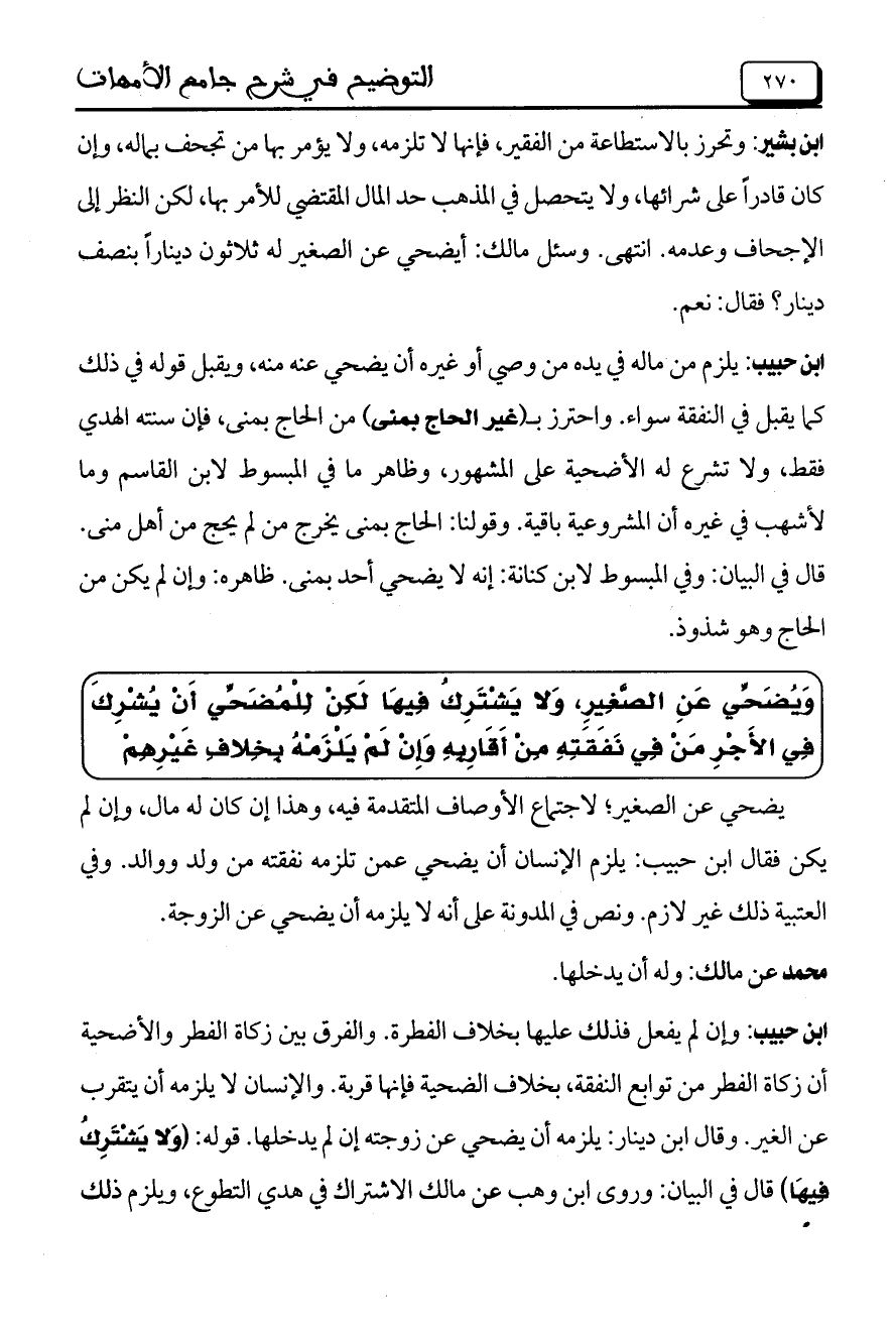 ابن بشير: وتحرز بالاستطاعة من الفقير، فإنها لا تلزمه، ولا يؤمر بها من تجحف بماله، وإن كان قادراً على شرائها، ولا يتحصل في المذهب حد المال المقتضي للأمر بها، لكن النظر إلى الإجحاف وعدمه. انتهى. وسئل مالك: أيضحي عن الصغير له ثلاثون ديناراً بنصف دينار؟ فقال: نعم.