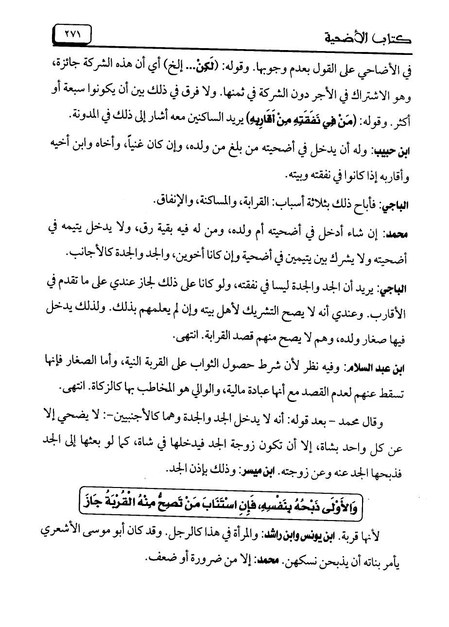 وقال محمد- بعد قوله: أنه لا يدخل الجد والجدة وهما كالأجنبيين-: لا يضحي إلا عن كل واحد بشاة، إلا أن تكون زوج الجد يدخلها في شاة، كما لو بعثها إلى الجد فذبحها الجد عنه وعن زوجته. ابن ميسر: وذلك بإذن الجد.