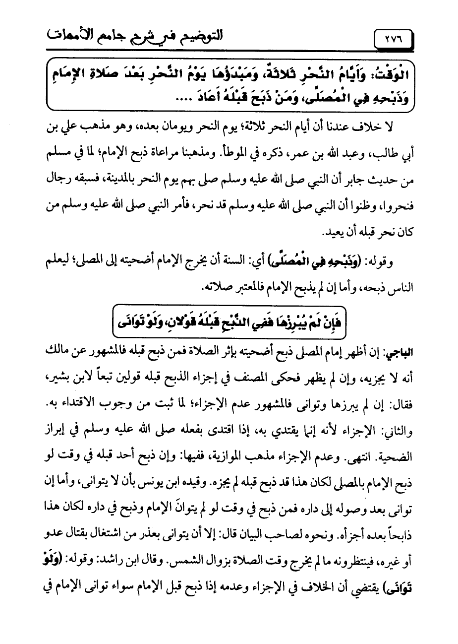 الباجي: إن أظهر إمام المصلى ذبح أضحيته بإثر الصلاة فمن ذبح قبله فالمشهور عن مالك أنه لا يجزيه، وإن لم يظهر فحكى المصنف في إجزاء الذبح قبله قولين تبعاً لابن بشير، فقال: إن لم يبرزها وثواني فالمشهور عدم الإجزاء؛ لما ثبت من وجوب الاقتداء به. والثاني: الإجزاء لأنه إنما يقتدي به، إذا اقتدى بفعله صلى الله عليه وسلم في إبراز الضحية. انتهى. وعدم الإجزاء مذهب الموازية، ففيها: ون ذبح أحد قبله في وقت لو ذبح الإمام بالمصلى لكان هذا قد ذبح قبله لم يجزه. وقيد ابن يونس بأن لا يتوانى، وأما إن توانى بعد وصوله إلى داره فمن ذبح في وقت لو لم يتوانَ الإمام وذبح في داره لكان هذا ذابحاً بعده أجزأه. ونحوه لصاحب البيان قال: إلا أن يتوانى بعذر من اشتغال بقتال عدو أو غيره، فينتظرونه ما لم يخرج وقت الصلاة بزوال الشمس. وقال ابن راشد: وقوله: (وَلَوْ ثَوَانَي) يقتضي أن الخلاف في الإجزاء وعدمه إذا ذبح قبل الإمام سواء توانى الإمام في