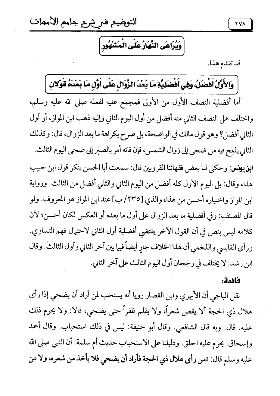 ابن يونس: وحكى لنا بعض فقهائنا القرويين قال: سمعت أبا الحسن ينكر قول ابن حبيب هذا، وقال: بل اليوم الأول كله أفضل من اليوم الثاني والثاني أفضل من الثالث. ورواية ابن المواز واختياره أحسن من هذا، والذي [235/ب] عند ابن المواز هو المعروف. ولو قال المصنف: وفي أفضلية ما بعد الزوال على أول ما بعده أو العكس لكان أحسن؛ لأن كلامه ليس بنص في أن القول الآخر يقتضي أفضلية أول الثاني لاحتمال فهم التساوي. ورأى القابسي واللخمي أن هذا الخلاف جارٍ أيضاً فيما بين آخر الثاني وأول الثالث. وقال ابن رشد: لا يختلف في رجحان أول اليوم الثالث على آخر الثاني.