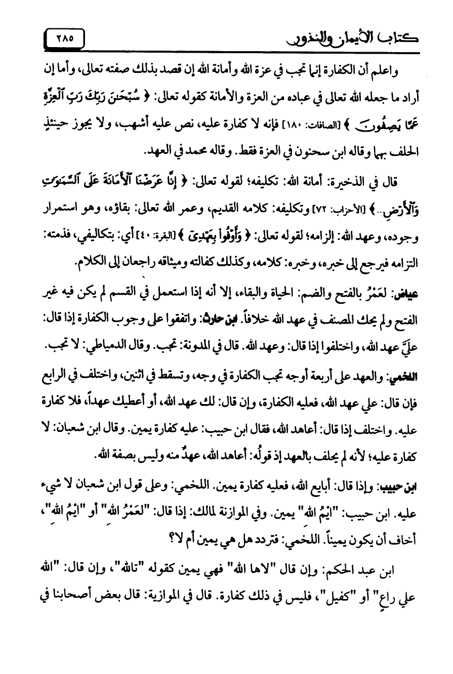 واعلم أن الكفارة إنما تجب في عزة الله وأمانة الله إن قصد بذلك صفته تعالى، وأما إن أراد ما جعله الله تعالى في عباده من العزة والأمانة كقوله تعالى: (سُبّحَنَ رَبِكَ رَبِ الْعِزَّةِ عَمّا يَصِفُونَ ([الصافات: 180] فإنه لا كفارة عليه، نص عليه أشهب، ولا يجوز حينئذٍ الحلف بهما وقاله ابن سحنون في العزة فقط. وقاله محمد في العهد.
