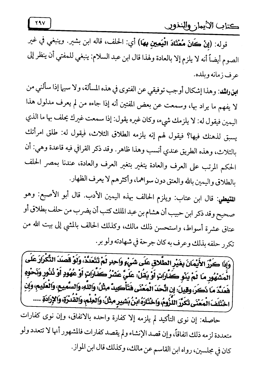 ابن راشد: وهذا إشكال أوجب توفيقي عن الفتوى في هذه المسألة، ولا سيما إذا سألني من لا يفهم ما يراد بها، وسمعت عن بعض المفتين أنه إذا جاءه من لم يعرف مدلول هذا اليمين فيقول له: لا يلزمك شيء، وكان غيره يقول: إذا سمعت غيرك يحلف بها ما الذي يسبق لذهنك فيها؟ فيقول لهم إنه يلزمه الطلاق الثلاث، فيقول له: طلق امرأتك بالثلاث، وهذه الطريق عندي أنسب وهذا ظاهر. وقد ذكر القرافي فيه قاعدة وهي: أن الحكم المرتب على العرف والعادة يتغير بتغير العرف والعادة، عندنا بمصر الحلف بالطلاق واليمين بالله والعتق دون سواهما، وأكثرهم لا يعرف الظهار.