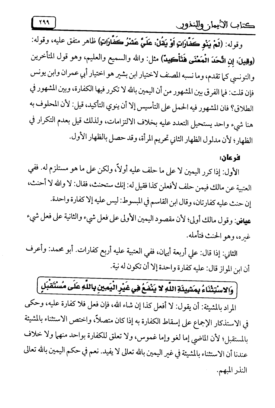 وَالاسْتِثْنَاءُ بمَشِيئَةِ اللهِ لا يَنْفَعُ فِي غَيْرِ الْيَمِينِ بِاللهِ عَلَى مُسْتَقْبَلٍ