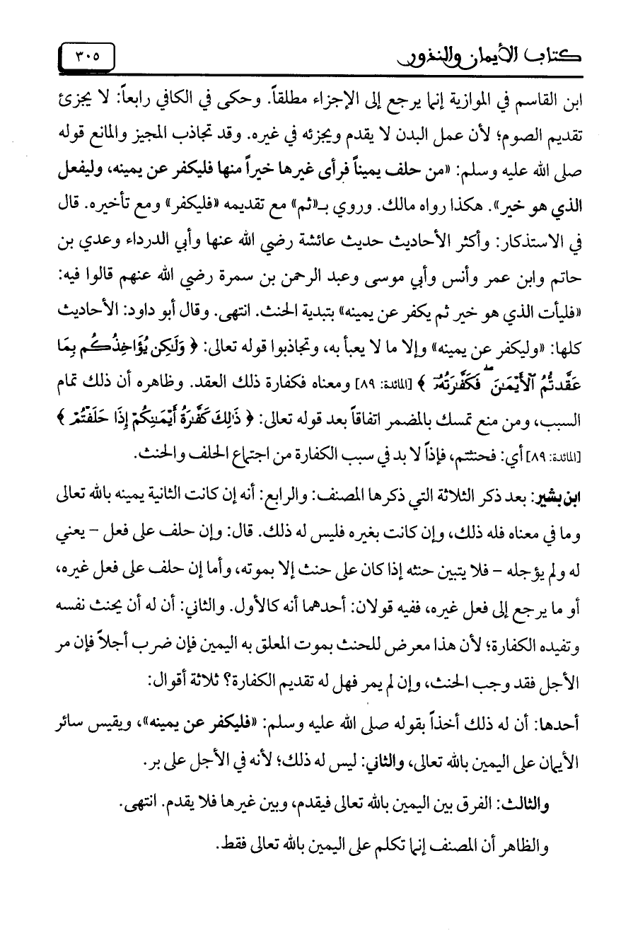 ابن القاسم في الموازية إنما يرجع إلى الإجزاء مطلقاً. وحكى في الكافي رابعاً: لا يجزئ تقديم الصوم؛ لأن عمل البدن لا يقدم ويجزئه في غيره. وقد تجاذب المجيز والمانع قوله صلى الله عليه وسلم: "من حلف يميناً فرأى غيرها خيراً منها فيكفر عن يمينه، وليفعل الذي هو خير". هكذا رواه مالك. وروي بـ "ثم" مع تقديمه "فليكفر" ومع تأخيره. قال في الاستذكار: وأكثر الأحاديث حديث عائشة رضي الله عنها وأبي الدرداء وعدي بن حاتم وابن عمر وأنس وأبي موسى وعبد الرحمن بن سمرة رضي الله عنهم قالوا فيه: "فليأت الذي هو خير ثم يكفر عن يمينه" بتبدية الحنث. انتهى. وقال أبو داود: الأحاديث كلها: "وليكفر عن يمينه" وإلا ما لا يعبأ به، وتجاذبوا قوله تعالى: (وَلَكِن يُؤَاخِذُكُم بِمَا عَقَّدتُمُ الأَيْمَانَ فَكَفَّرَتُهُ ([المائدة: 89] أي: فحنثتم، فإذاً لابد في سبب الكفارة من اجتماع الحلف والحنث.