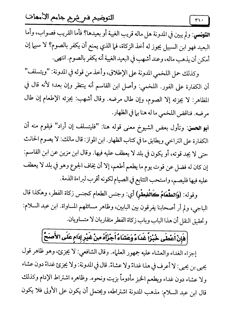 التونسي: ولم يبين في المدونة هل ماله قريب الغيبة أو بعيدها؟ فأما القريب فصواب، وأما البعيد فهو ابن السبيل يجوز له أخذ الزكاة، فما الذي يمنع أن يكفر بالصوم؟ لا سيما إن أمكن أن يذهب ماله، وعند أشهب في البعيد الغيبة أنه يكفر بالصوم. انتهى.