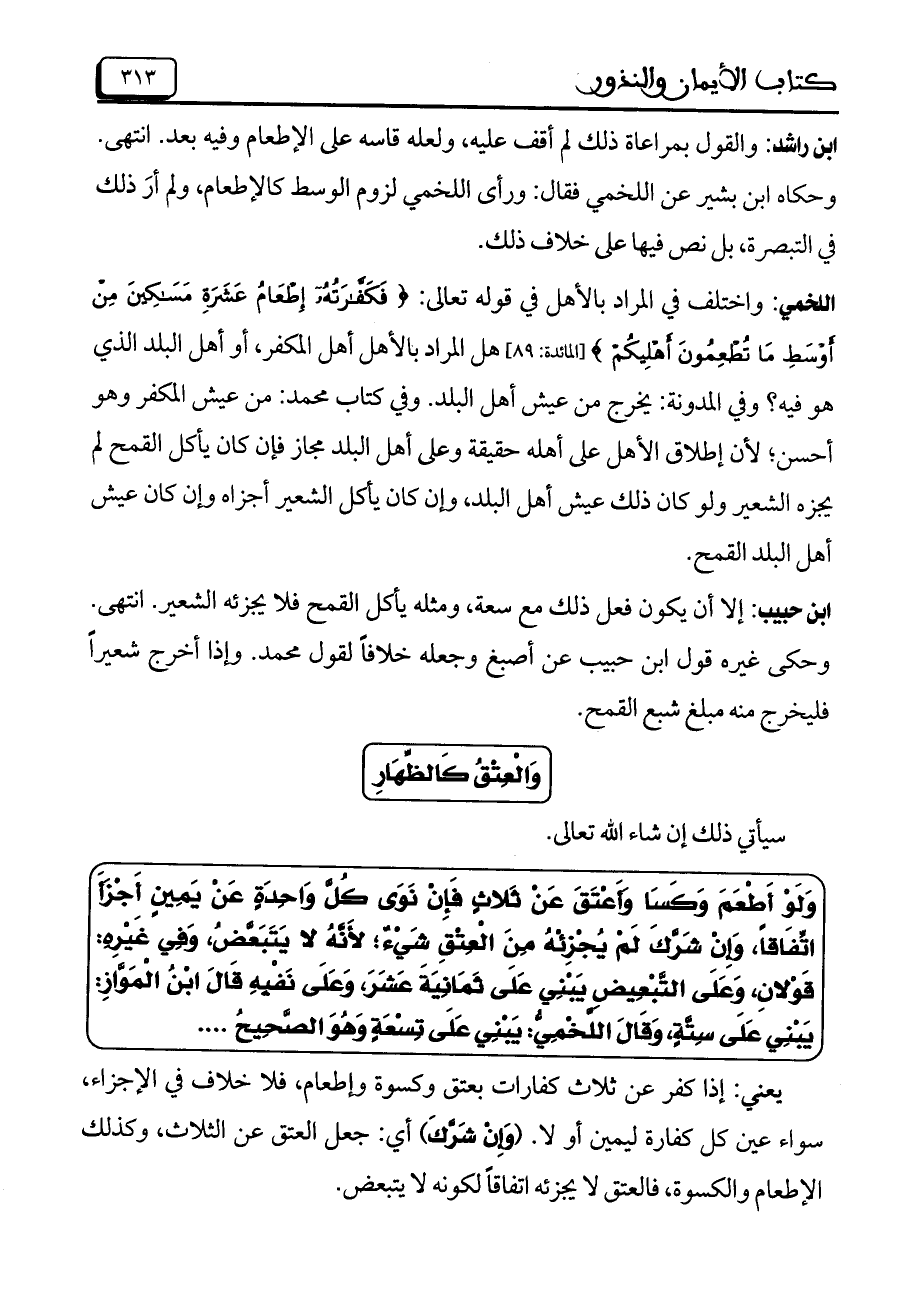 اللخمي: واختلف ي المراد بالأهل في قوله تعالى: (فَكَفَّرَتُهُ إِطْعَامُ عَشَرةِ مَسَكِينَ مِنْ أَوْسَطِ مَا تُطْعِمُونَ أَهْلِيكُمْ ([المائدة: 89] هل المراد بالأهل أهل المكفر، أو أهل البلد الذي هو فيه؟ وفي المدونة: يخرج من عيش أهل البلد. وفي كتاب محمد: من عيش المكفر وهو أحسن؛ لأن إطلاق الأهل على أهله حقيقة وعلى أهل البلد مجاز فإن كان يأكل القمح لم يجزه الشعير ولو كان ذلك عش أهل البلد، وإن كان يأكل الشعير أجزاه وإن كان عيش أهل البلد القمح.