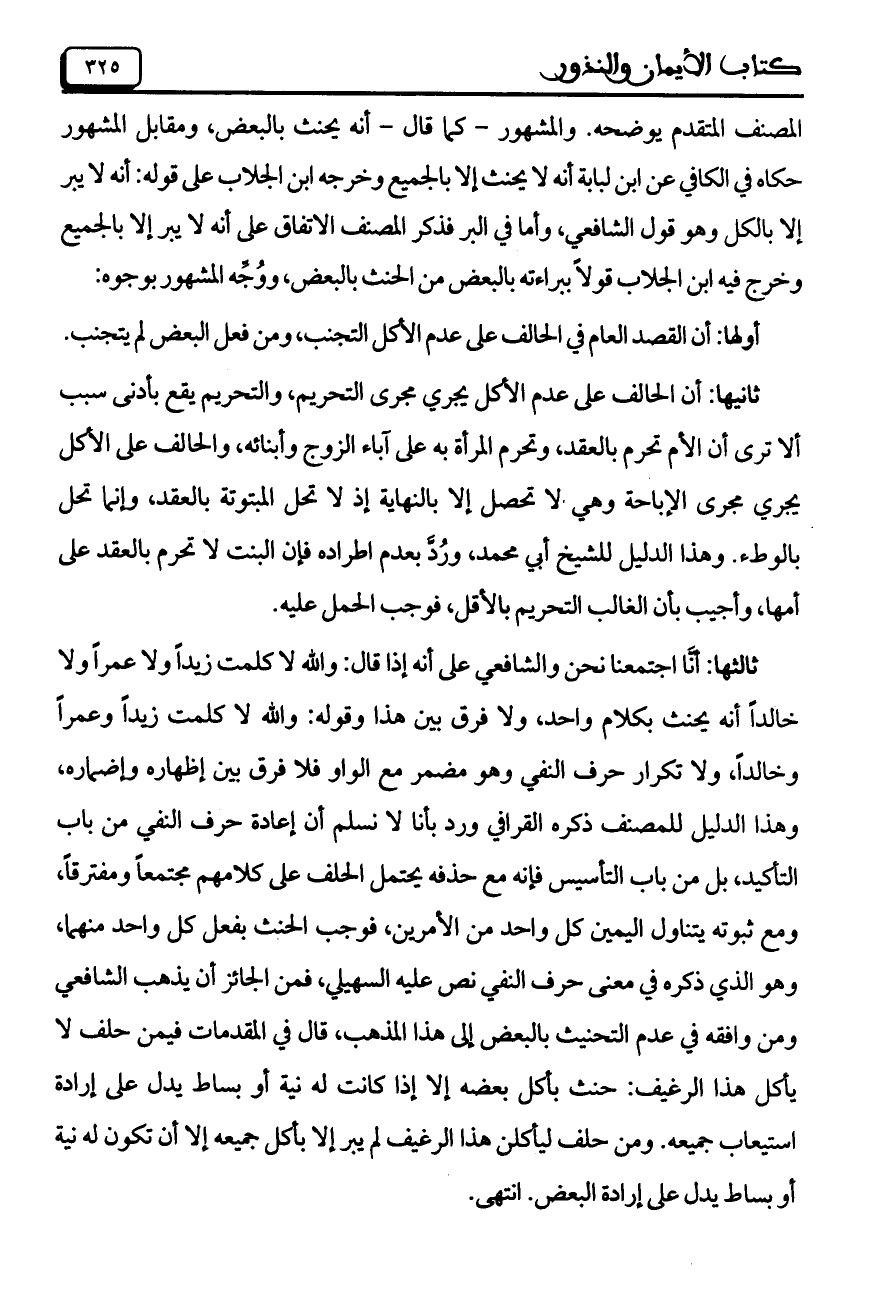 ثالثها: أنَّا اجتمعنا نحن والشافعي على أنه إذا قال: والله لا كلمت زيداً ولا عمراً ولا خالداً أنه يحنث بكلام واحد، ولا فرق بين هذا وقوله: والله لا كلمت زيداً وعمراً وخالداً، ولا تكرار حرف النفي وهو مضمر مع الواو فلا فرق بين إظهاره وإضماره، وهذا الدليل للمصنف ذكره القرافي ورد بأنا لا نسلم أن إعادة حرف النفي من باب التأكيد، بل من باب التأسيس فإنه مع حذفه يحتمل الحلف على كلامهم مجتمعاً ومفترقاً، ومع ثبوته يتناول اليمين كل واحد من الأمرين، فوجب الحنث بفعل كل واحد منهما، وهو الذي ذكره في معنى حرف النفي نص عليه السهيلي، فمن الجائز أن يذهب الشافعي ومن وافقه في عدم التحنيث بالبعض إلى هذا المذهب، قال في المقدمات فيمن حلف لا يأكل هذا الرغيف: حنث بأكل بعضه إلا إذا كانت له نية أو بساط يدل على إرادة استيعاب جميعه. ومن حلف ليأكلن هذا الرغيف لم يبر إلا بأكل جميعه إلا أن تكون له نية أو بساط يدل على إرادة البعض. انتهى.