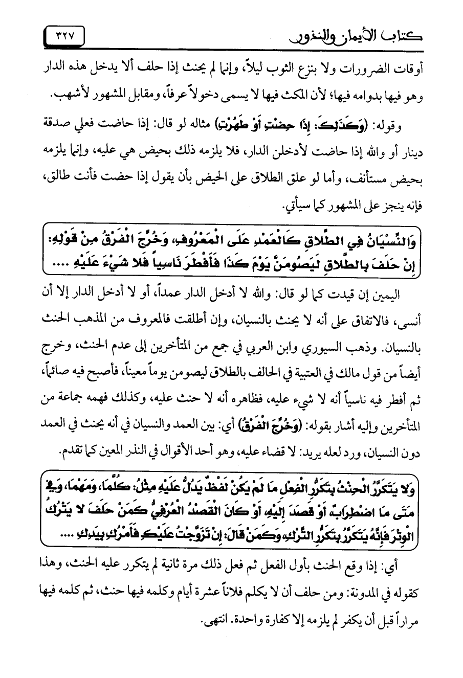 اليمين إن قيدت كما لو قال: والله لا أدخل الدار عمداً، أو لا أدخل الدار إلا أن أنسى، فالاتفاق على أنه لا يحنث بالنسيان، وإن أطلقت فالمعروف من المذهب الحنث بالنسيان. وذهب السيوري وابن العربي في جمع من المتأخرين إلى عدم الحنث، وخرج أيضاً من قول مالك في العتبية في الحالف بالطلاق ليصومن يوماً معيناً، فأصبح فيه صائماً، ثم أفطر فيه ناسياً أنه لا شيء عليه، فظاهره أنه لا حنث عليه، وكذلك فهمه جماعة من المتأخرين وإليه أشار بقوله: (وَخُرِّجَ الْفَرْقُ) أي: بين العمد والنسيان في أنه يحنث في العمد دون النسيان، ورد لعله يريد: لا قضاء عليه، وهو أحد الأقوال في النذر المعين كما تقدم.