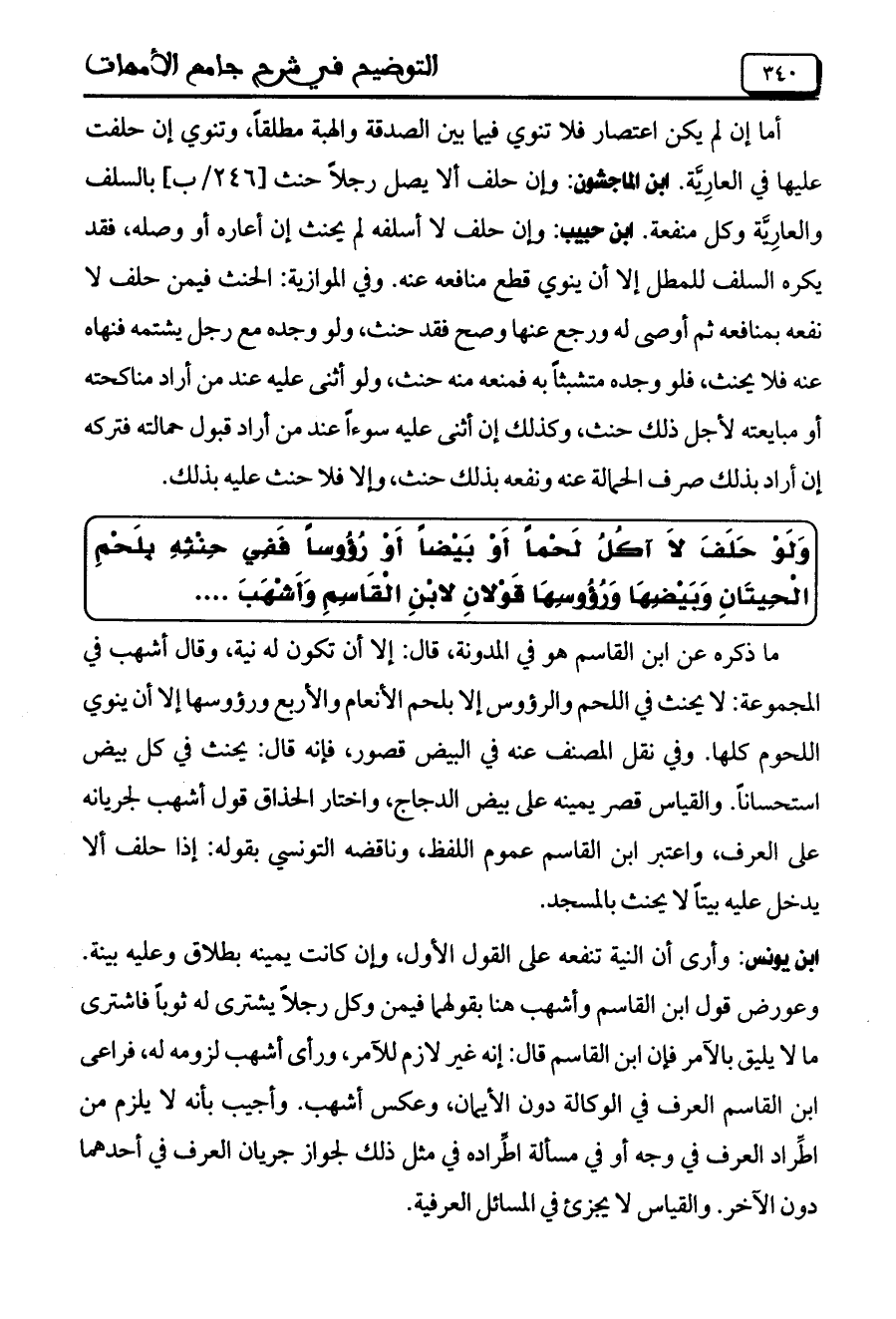 وَلَوْ حَلَفَ لاَ آكُلُ لَحْماً أَوْ بَيْضاً أَوْ رُؤُوساً فَفِي حِنْثِهِ بلَحْمِ الْحِيتَانِ وَبَيْضِهَا وَرُْوسِهَا قَوْلانِ لابْنِ الْقَاسِمِ وَأَشْهَبَ ...