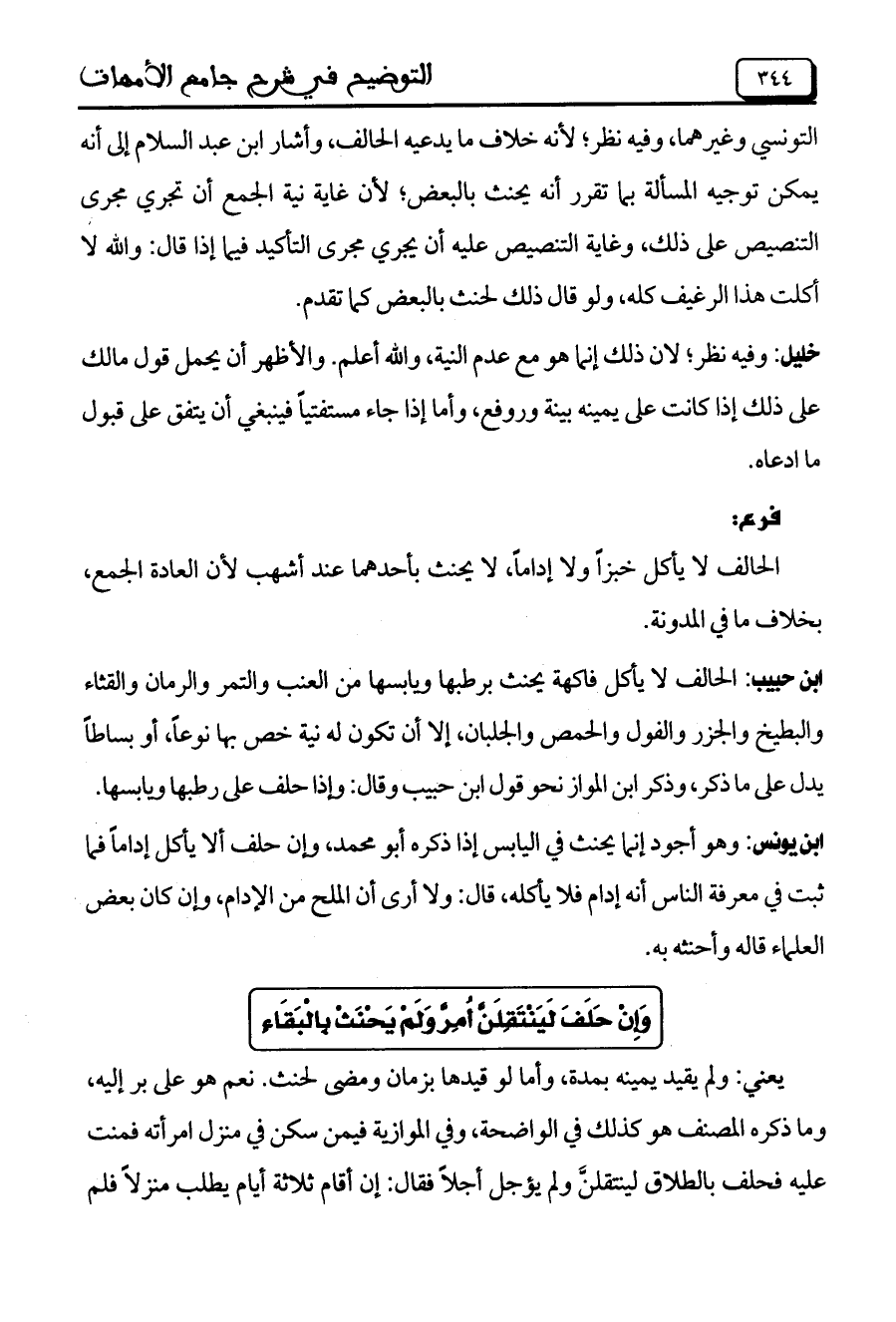ابن يونس: وهو أجود إنما يحنث في اليابس إذا ذكره أبو محمد، وإن حلف ألا يأكل إداماً فما ثبت في معرفة الناس أنه إدام فلا يأكله، قال: ولا أرى ان الملح من الإدام، وإن ان بعض العلماء قاله وأحنثه به.