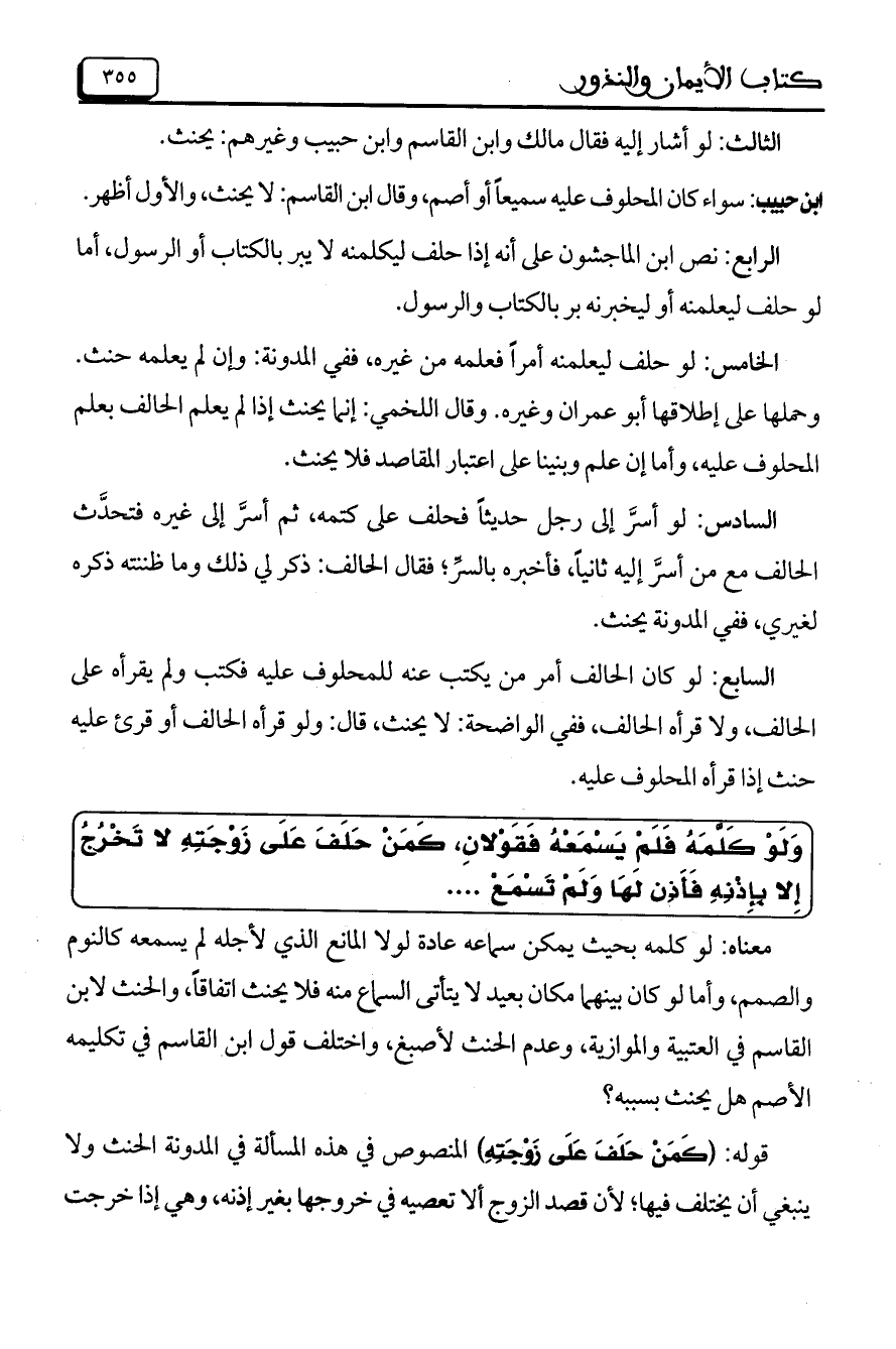 الرابع: نص ابن الماجشون على أنه إذا حلف ليكلمنه لا يبر بالكتاب أو الرسول، أما لو حلف ليعلمنه أو ليخبرنه بر بالكتاب والرسول.