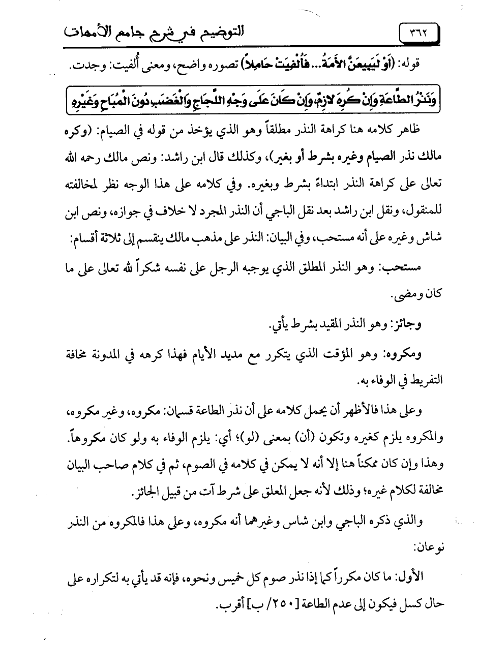 ظاهر كلامه هنا كراهة النذر مطلقاً وهو الذي يؤخذ من قوله في الصيام: (وكره مالك نذر الصيام وغيره بشرط أو بغير)، وكذلك قال ابن راشد: ونص مالك رحمه الله تعالى على كراهة النذر ابتداءً بشرط وبغيره. وفي كلامه على هذا الوجه نظر لمخالفته للمنقول، ونقل ابن راشد بعد نقل الباجي أن النذر المجرد لا خلاف في جوازه، ونص ابن شاش وغيره على أنه مستحب، وفي البيان: النذر على مذهب مالك ينقسم إلى ثلاثة أقسام: