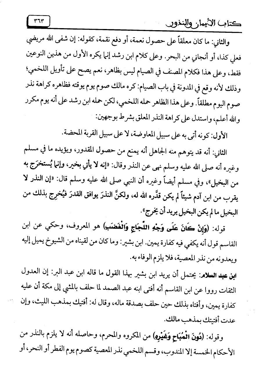 والثاني: ما كان معلقاً على حصول نعمة، أو دفع نقمة، كقوله: إن شفى الله مريضي فعلي كذا، أو أنجاني من البحر. وعلى كلام ابن رشد إنما يكره الأول من هذين النوعين فقط، وعلى هذا فكلام المصنف في الصيام ليس بظاهر، نعم يصح على تأويل اللخمي؛ وذلك لأنه وقع في المدونة في باب الصيام: كره مالك صوم يوم يوقته فظاهره كراهة نذر صوم اليوم مطلقاً. وعلى هذا الظاهر حمله اللخمين لكانحمله ابن رشد على أنه يوم مكرر والله أعلم، واستدل على كراهة النذر المعلق بشرط بوجهين: