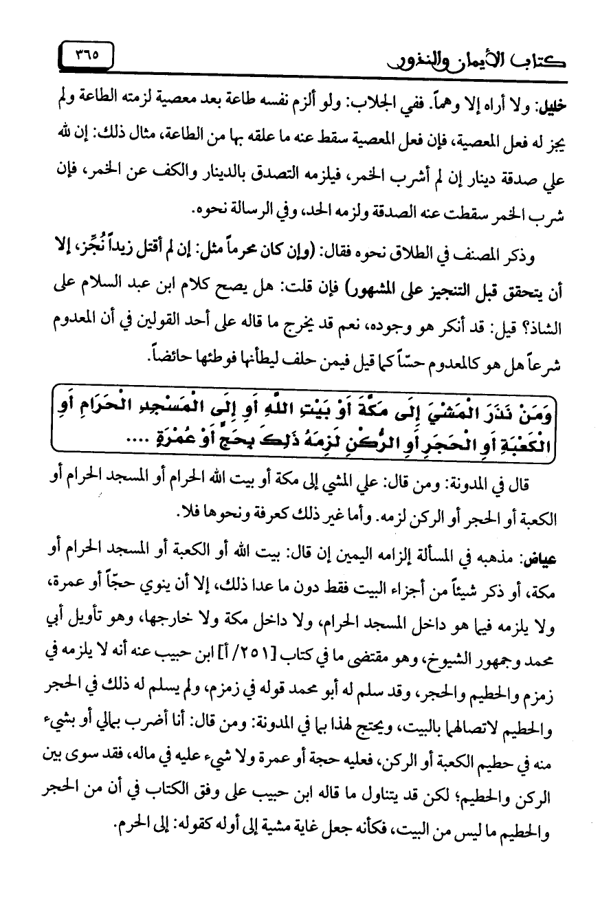 عياض: مذهبه في المسألة إلزامه اليمين إن قال: بيت الله أو الكعبة أو المسجد الحرام أو مكة، أو ذكر شيئاً من أجزاء البيت فقط دون ما عدا ذلك، إلا أن ينوي حجّاً أو عمرة، ولا يلزمه فيما هو داخل المسجد الحرام، ولا داخل مكة ولا خارجها، وهو تأويل أبي محمد وجمهور الشيوخ، وهو مقتضى ما في كتاب [251/أ] ابن حبيب عنه أنه لا يلزمه في زمزم والحطيم والحجر وقد سلم له أبو محمد قوله في زمزم، ولم يسلم له ذلك في الحجر والحطيم لاتصالهما بالبيت، ويحتج لهذا بما في المدونة: ومن قال: أنا أضرب بمالي أو بشيء منه في حطيم الكعبة أو الركن، فعليه حجة أو عمرة ولا شيء عليه في ماله، فقد سوى بين الركن والحطيم؛ لكن قد يتناول ما قاله ابن حبيب على وفق الكتاب في أن من الحجر والحطيم ما ليس من البيت، فكأنه جعل غاية مشية إلى أوله كقوله: إلى الحرم.
