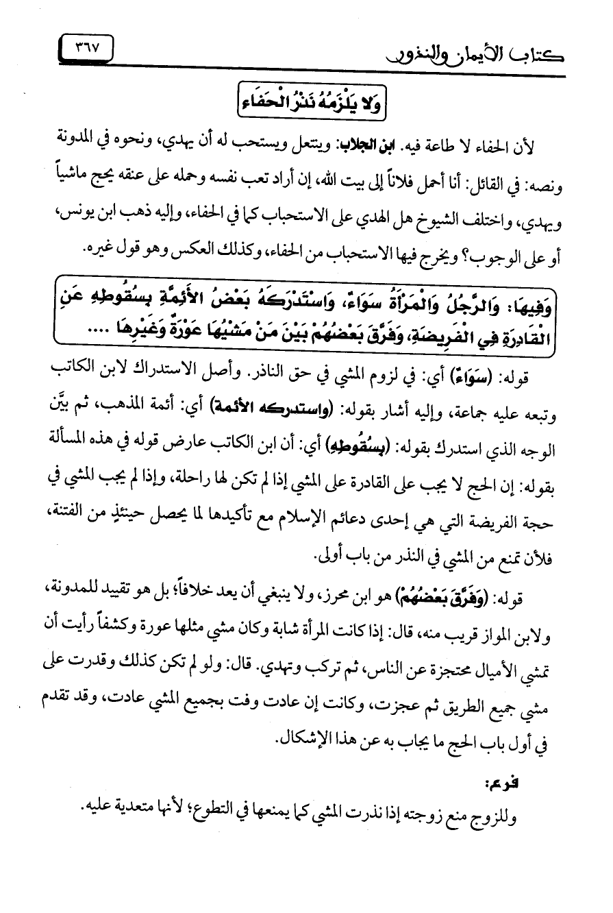وَفِيهَا: وَالرَّجُلُ وَالْمَرْأَةُ سَوَاءٌ، وَاسْتَدْرَكَهُ بَعْضُ الأَئِمَّةِ بِسُقُوطِهِ عَنِ الْقَادِرَةِ فِي الْفَرِيضَةِ، وَفَرَّقَ بَعْضُهُمْ بَيْنَ مَنْ مَشْيُهَا عَوْرَةٌ وَغَيْرِهَا ...