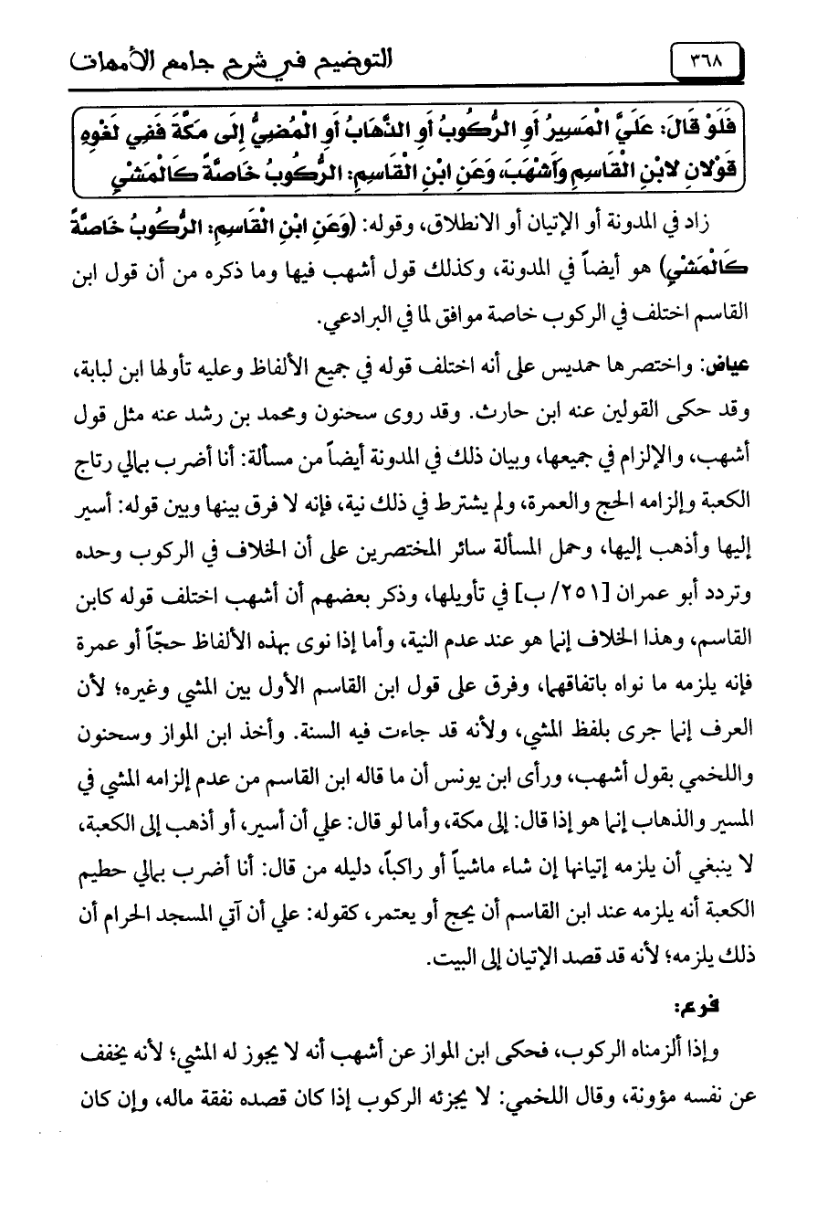 زاد في المدونة أو الإتيان أو الانطلاق، وقوله: (وَعَنِ ابْنِ الْقَاسِمِ: الرُّكُوبُ خَاصَّةً كَالْمَشْي) هو أيضاً في المدونة، وكذلك قول أشهب فيها وما ذكره من أن قول ابن القاسم اختلف في الركوب خاصة موافق لما في البرادعي.