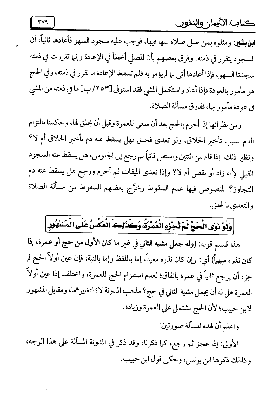 ابن بشير: ومثلوه بمن صلى صلاة سها فيها، فوجب عليه سجود السهو فأعادها ثانياً، أن السجود يتقرر في ذمته. وفرق بعضهم بأن المصلي أخطأ في الإعادة وإنما تقررت في ذمته سجدتا السهو، فإذا أعادها أتى بما لم يؤمر به فلم تسقط الإعادة ما تقرر في ذمته، وفي الحج هو مأمور بالعودة فإذا أعاد واستكمل المشي فقد استوفى [253/ب] ما في ذمته من المشي في عودة مأمور بها، ففارق مسألة الصلاة.