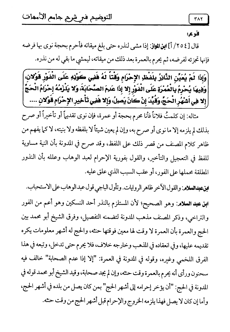 وَإِذَا لَمْ يُعَيِّنِ النَّاذِرُ بِلَفْظِ الإِحْرَامِ وَقْتاً لَهُ فَفِي كَوْنِهِ عَلَى الْفَوْرِ قَوْلانِ، وَفِيهَا يُحْرِمُ بالْعُمْرَةِ عَلَى الْفَوْرِ إِلا إِذَا عَدِمَ الصَّحَابَةَ، وَلا يَلْزَمُهُ إِحْرَامُ الْحَجِّ إِلا فِي أَشْهُرِ الْحَجِّ، وَقُيِّدَ إِنْ كَانَ يَصِلُ، وَإِلا فَفِي تَاخِيرِ الإِحْرَامِ قَوْلانِ ....