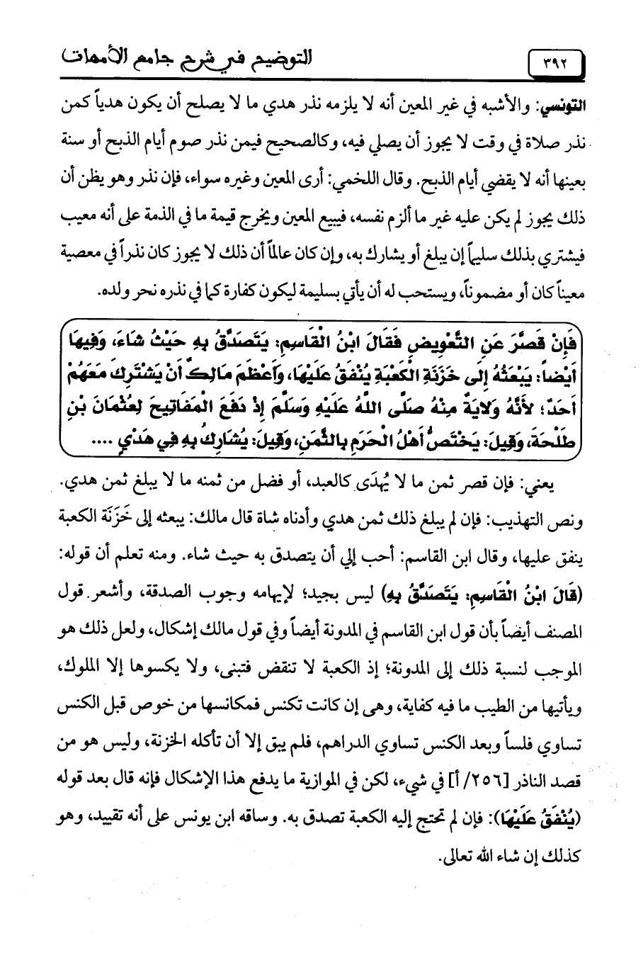 يعني: فإن قصر ثمن ما لا يُهدَى كالعبد، أو فضل من ثمنه ما لا يبلغ ثمن هدي. ونص التهذيب: فإن لم يبلغ ذلك ثمن هدي وأدناه شاة قال مالك: يبعثه إلى خَزَنَة الكعبة ينفق عليها، وقال ابن القاسم: أحب إلي أن يتصدق به حيث شاء. ومنه تعلم أن قوله: (قَالَ ابْنُ الْقَاسِمِ: يَتَصَدَّقُ بهِ) ليس بجيد؛ لإيهامه وجوب الصدقة، وأشعر قول المصنف أيضاً بأن قول ابن القاسم في المدونة أيضاً وفي قول مالك إشكال، ولعل ذلك هو الموجب لنسبة ذلك إلى المدونة؛ إذ الكعبة لا تنقض فتبنى، ولا يكسوها إلا الملوك، ويأتيها من الطيب ما فيه كفاية، وهي إن كانت تكنس فمكانسها من خوص قبل الكنس تساوي فلساً وبعد الكنس تساوي الدراهم، فلم يبق إلا أن تأكله الخزنة، وليس هو من قصد الناذر [256/أ] في شيء، لكن في الموازية ما يدفع هذا الإشكال فإنه قال بعد قوله (يُنْفَقُ عَلَيْهَا): فإن لم تحتج إليه الكعبة تصدق به. وساقه ابن يونس على أنه تقييد، وهو كذلك إن شاء الله تعالى.