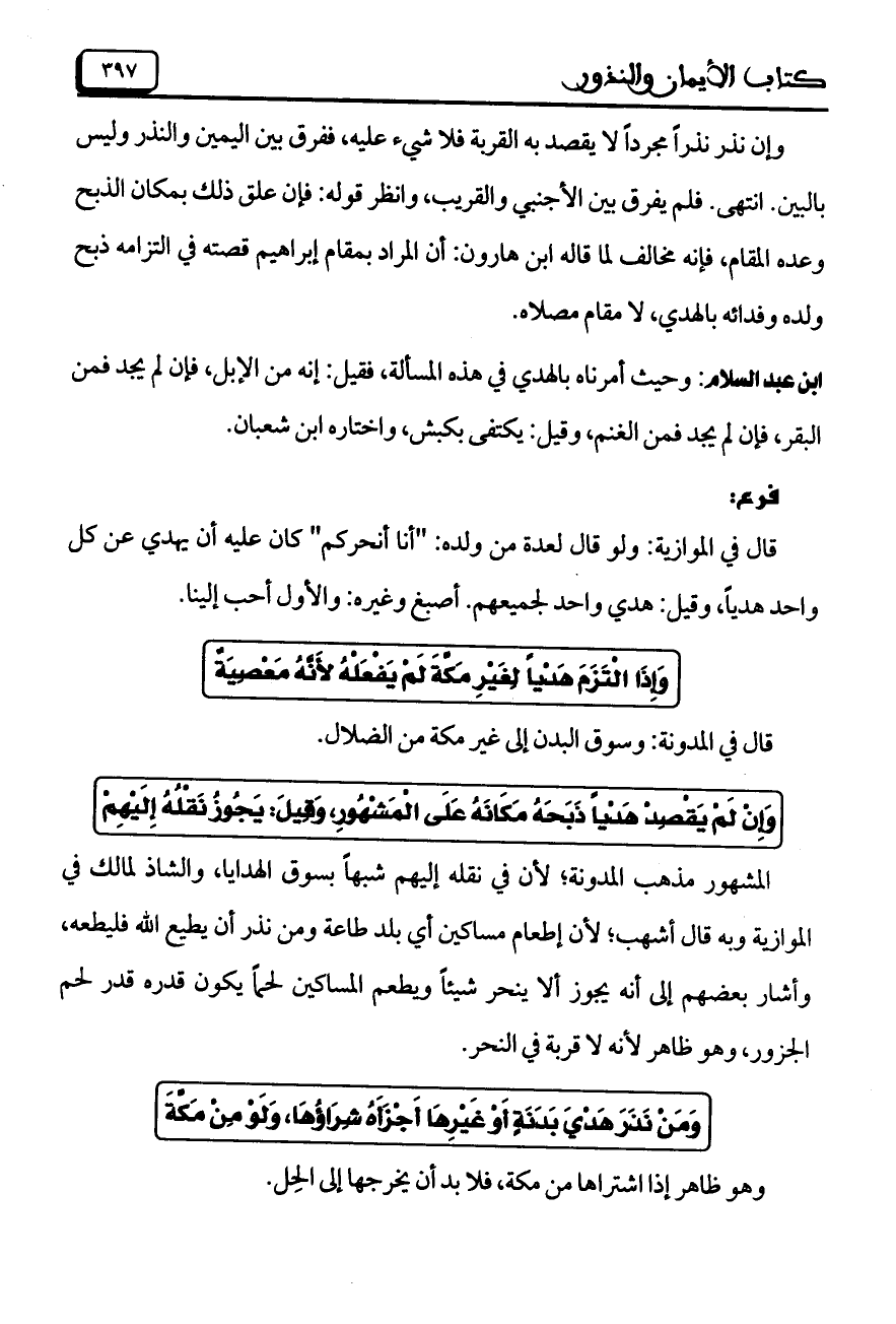 وإن نذر نذراً مجرداً يقصد به القربة فلا شيء عليه، ففرق بين اليمين والنذر وليس بالبين. انتهى. فلم يفرق بين الأجنبي والقريب، وانظر قوله: فإن علق ذلك بمكان الذبح وعده المقام، فإنه مخالف لما قاله ابن هارون: أن المراد بمقام إبراهيم قصته في التزامه ذبح ولده وفدائه بالهدي، لا مقام مصلاه.