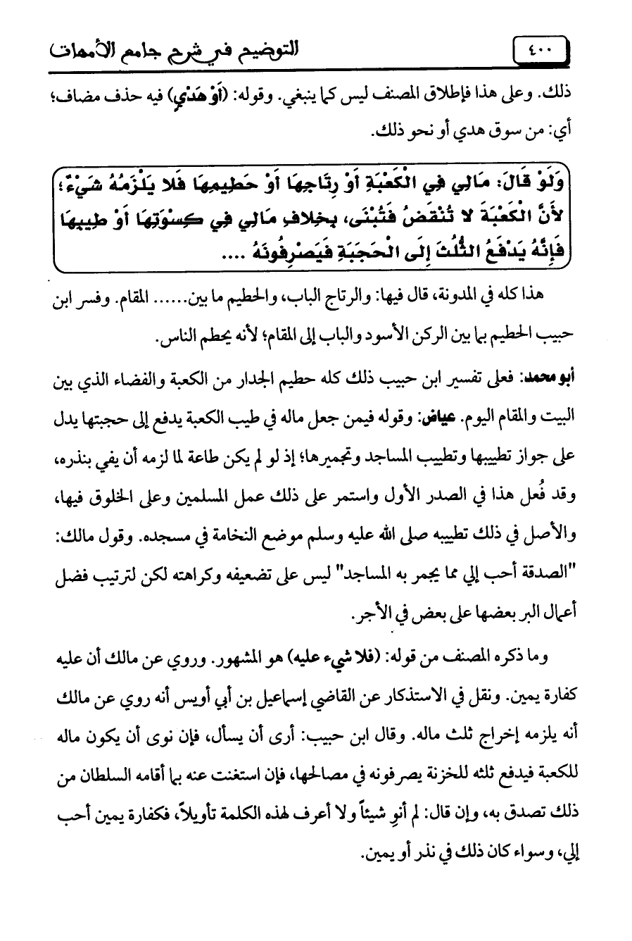 أبو محمد: فعلى تفسير ابن حبيب ذلك كله حطيم الجدار من الكعبة والفضاء الذي بين البيت والمقام اليوم. عياض: وقوله فيمن جعل ماله في طيب الكعبة يدفع إلى حجبتها يدل على جواز تطيبها وتطييب المساجد وتجميرها؛ إذ لو لم يكن طاعة لما لزمه أن يفي بنذره، وقد فُعل هذا في الصدر الأول واستمر على ذلك عمل المسلمين وعلى الخلوق فيها، والأصل في ذلك تطييبه صلى الله عليه وسلم موضع النخامة في مسجده. وقول مالك: "الصدقة أحب إلي مما يجمر به المساجد" ليس على تضعيفه وكراهته لكن لترتيب فضل أعمال البر بعضها على بعض في الجر.