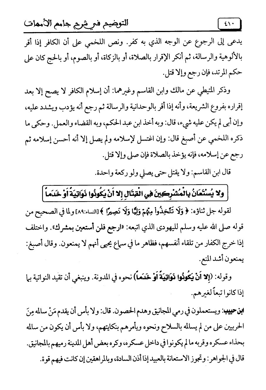 ولا يُسْتَعَانُ بِالْمُشْرِكِينَ فِي الْقِتَالِ إِلا أَنْ يَكُونُوا نَوَاتِيَةً أَوْ خَدَماً
