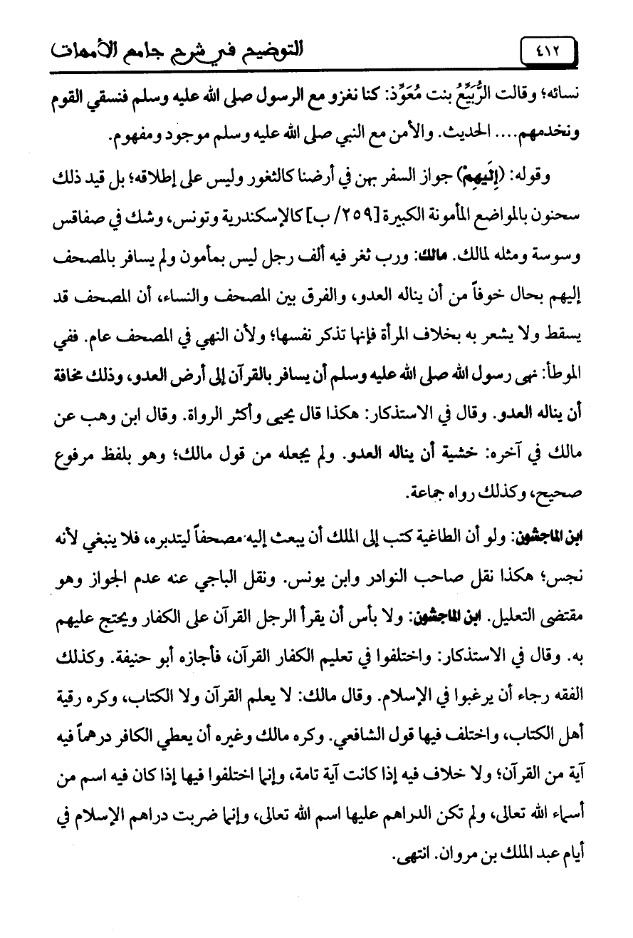 وقوله: (إِلَيهِمْ) جواز السفر بهن في أرضنا كالثغور وليس على إطلاقه؛ بل قيد ذلك سحنون بالمواضع المأمونة الكبيرة [259/ ب] كالإسكندرية وتونس، وشك في صفاقس وسوسة ومثله لمالك. مالك: ورب ثغر فيه ألف رجل ليس بمأمون ولم يسافر بالمصحف إليهم بحال خوفاً من أن يناله العدو، والفرق بين المصحف والنساء، أن المصحف قد يسقط ولا يشعر به بخلاف المرأة فإنها تذكر نفسها؛ ولأن النهي في المصحف عام. ففي الموطأ: نهى رسول الله صلى الله عليه وسلم أن يسافر بالقرآن إلى أرض العدو، وذلك مخافة أن يناله العدو. وقال في الاستذكار: هكذا قال يحيى وأكثر الرواة. وقال ابن وهب عن مالك في آخره: خشية أن يناله العدو. ولم يجعله من قول مالك؛ وهو بلفظ مرفوع صحيح، وكذلك رواه جماعة.