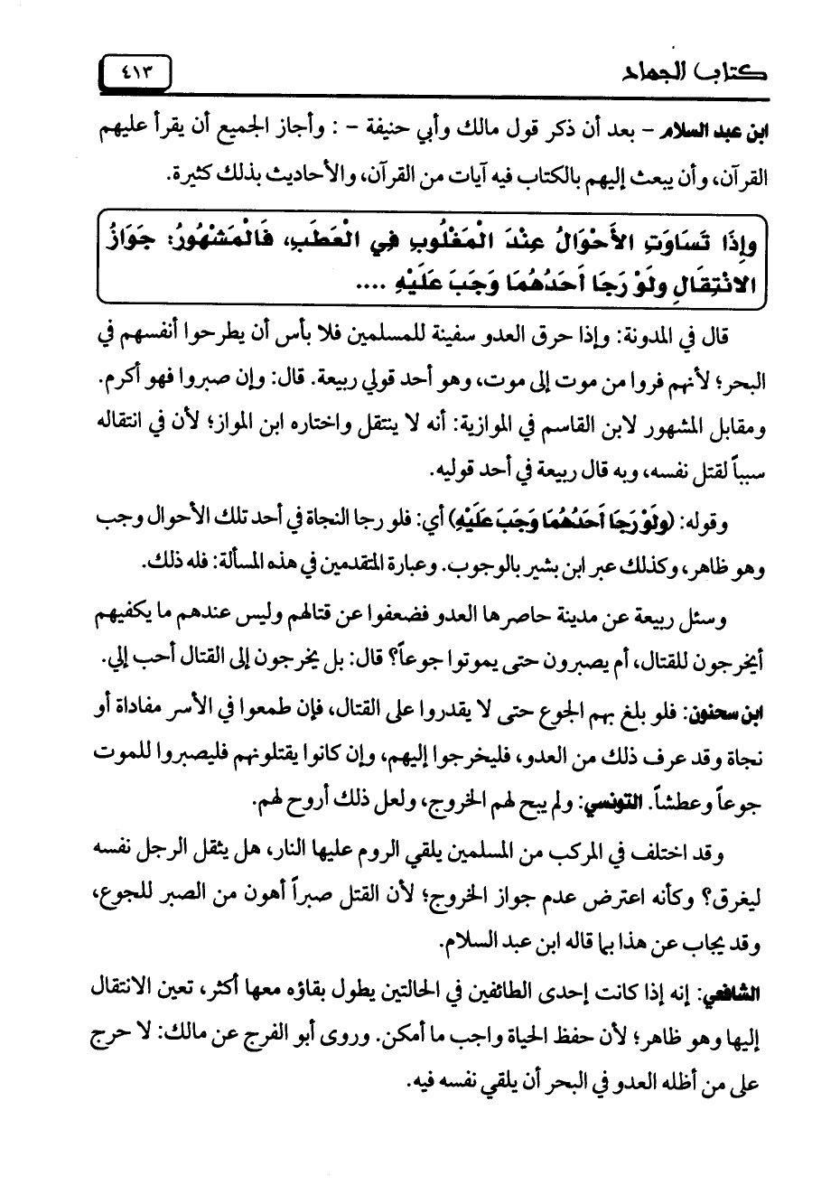 وقد اختلف في المركب من المسلمين يلقي الروم عليها النار، هل يثقل الرجل نفسه ليغرق؟ وكأنه اعترض عدم جواز الخروج؛ لأن القتل صبراً أهون من الصبر للجوع، وقد يجاب عن هذا بما قاله ابن عبد السلام.