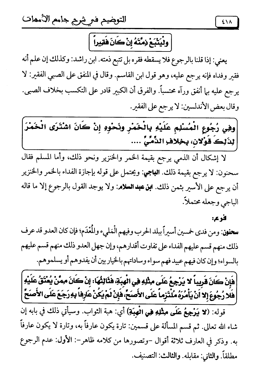 لا إشكال أن الذمي يرجع بقيمة الخمر والخنزير ونحو ذلك، وأما المسلم فقال سحنون: لا يرجع بقيمة ذلك. الباجي: ويحتمل على قوله بإجازة الفداء بالخمر والخنزير أن يرجع على الأسير بثمن ذلك. ابن عبد السلام: ولا يوجد القول بالرجوع إلا ما قاله الباجي وجعله محتملاً.