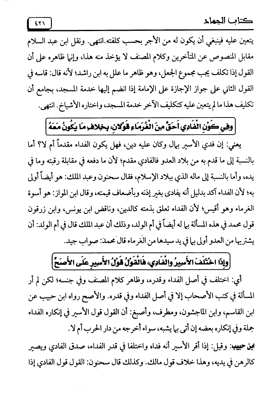 يعني: إن فدي الأسير بمال وكان عليه دين، فهل يكون الفداء مقدماً أم لا؟ أما بالنسبة إلى ما قدم به من بلاد العدو فالفادي مقدم؛ لأن ما دفعه في مقابلة رقبته وما في يده، وأما بالنسبة إلى ماله الذي ببلاد الإسلام، فقال سحنون وعبد الملك: هو أيضاً أولى به؛ لأن الفداء آكد بدليل أنه يفادي بغير إذنه وبأضعاف قيمته، وقال ابن المواز: هو أسوة الغرماء وهو أقيس؛ لأن الفداء تعلق بذمته كالدين، وناقض ابن يونس، وابن زرقون قول محمد في هذه المسالة بما له أيضاً في أم الولد، وذلك أن عبد الملك قال في أم الولد: أن يشتريها من العدو أولى بما في يد سيدها من الغرماء قال محمد: صواب جيد.