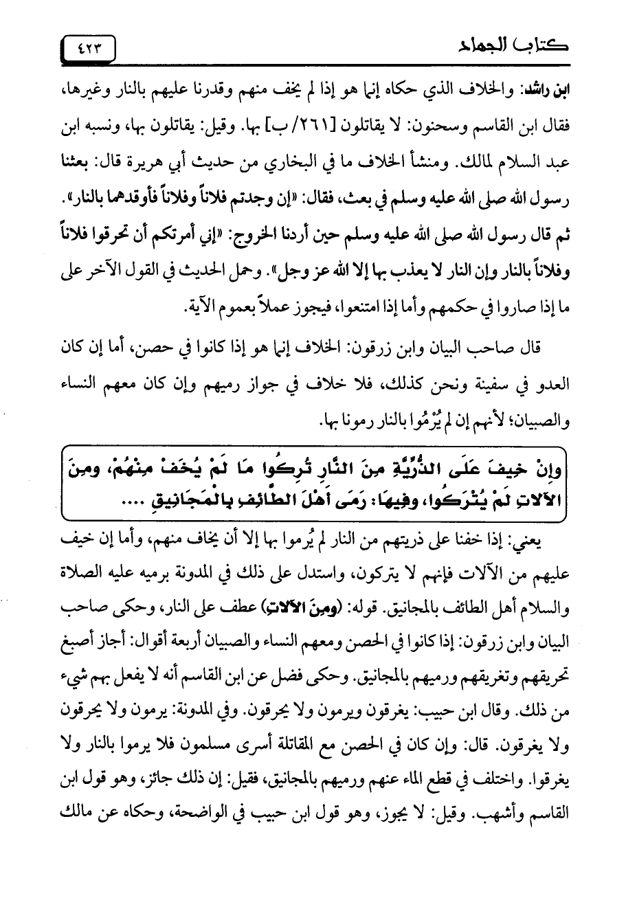 وإِنْ خِيفَ عَلَى الذُّرِّيَّةِ مِنَ النَّارِ تُرِكُوا مَا لَمْ يُخَفْ مِنْهُمْ، ومِنَ الآلاتِ لَمْ يُتْرَكُوا، وفِيهَا: رَمَى أَهْلَ الطَّائِفِ بِالْمَجَانِيقِ ..