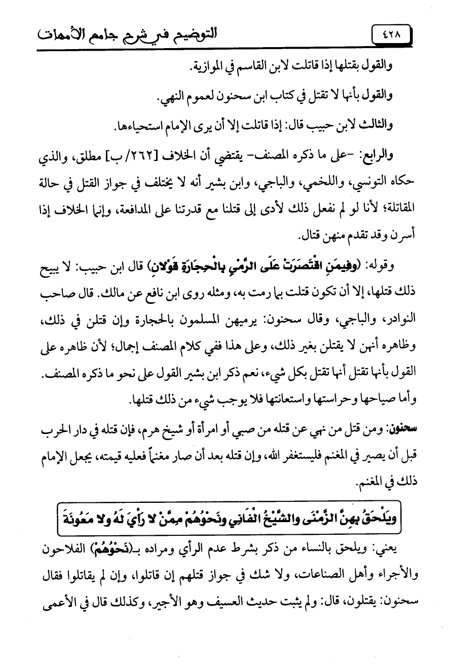 والقول بأنها لا تقتل في كتاب ابن سحنون لعموم النهي.
