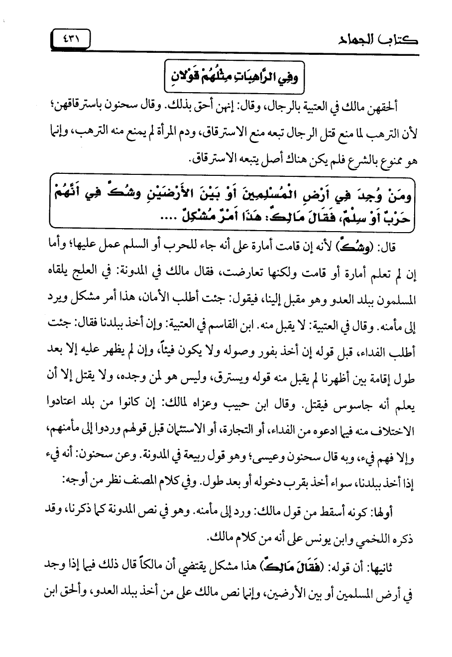 ومَنْ وُجِدَ فِي أَرْضِ الْمُسْلِمِينَ أَوْ بَيْنَ الأَرْضَيْنِ وشُكَّ فِي أَنَّهُمْ حَرْبُ أَوْ سِلْمُ، فَقَالَ مَالِكٌ: هَذَا أَمْرُ مُشْكِلٌ ...