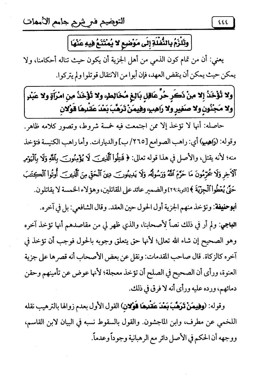 حاصله: أنها لا تؤخذ إلا ممن اجتمعت فيه خمسة شروط، وتصور كلامه ظاهر. وقوله: (رَاهِبٍ) أي: راهب الصوامع [265/ ب] والديارات. وأما راهب الكنيسة فتؤخذ منه؛ لأنه يقتل، والأصل في هذا قوله تعالى: (قَاتِلُوا الَّذِينَ لا يُؤْمِنُونَ بِاللَّهِ وَلا بِالْيَوْمِ الآخِرِ وَلا يُحَرِّمُونَ مَا حَرَّمَ اللَّهُ وَرَسُولُهُ وَلا يَدِينُونَ دِينَ الْحَقِّ مِنْ الَّذِينَ أُوتُوا الْكِتَابَ حَتَّى يُعْطُوا الْجِزْيَةَ ([التوبة: 29] والضمير عائد على المقاتلي، وهؤلاء الخمسة لا يقاتلون.