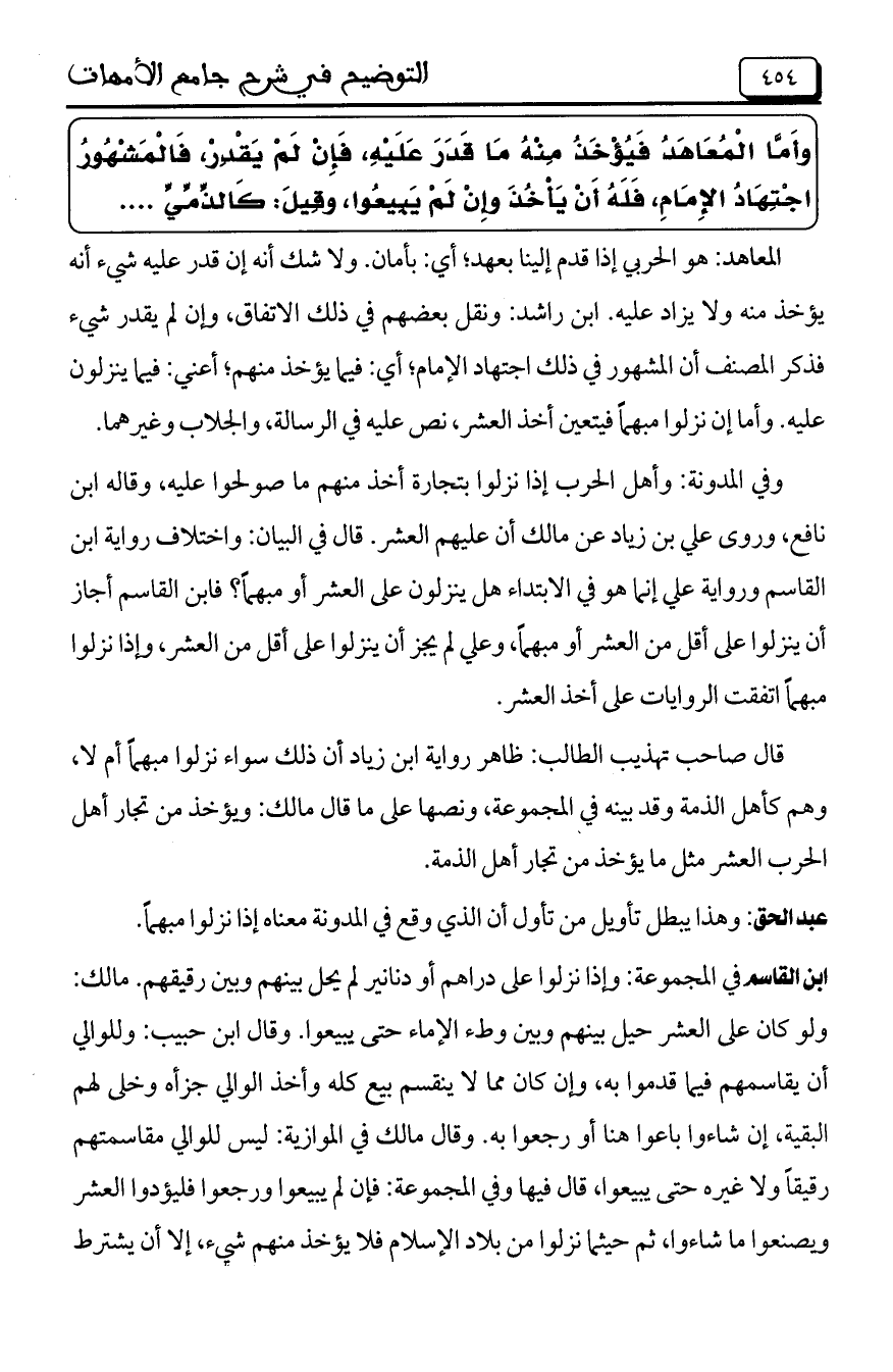 قال صاحب تهذيب الطالب: ظاهر رواية ابن زياد أن ذلك سواء نزلوا مبهماً أم لا، وهم كأهل الذمة وقد بينه في المجموعة، ونصها على ما قال مالك: ويؤخذ من تجار أهل الحرب العشر مثل ما يؤخذ من تجار أهل الذمة.