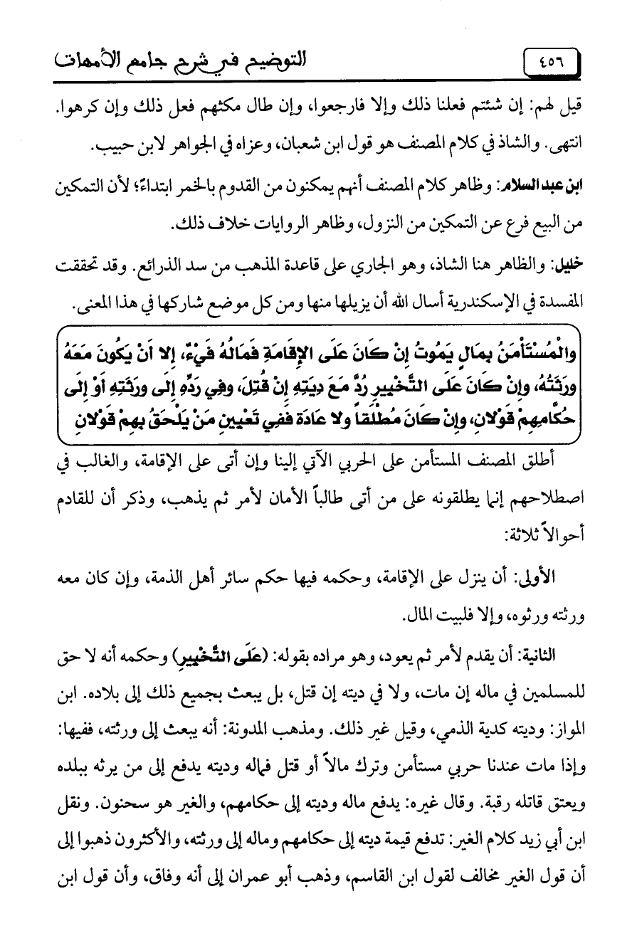 الثانية: أن يقدم لأمر ثم يعود، وهو مراده بقوله: (عَلَى التَّخْبِيرِ) وحكمه أنه لا حق للمسلمين في ماله إن مات، ولا في ديته إن قتل، بل يبعث بجميع ذلك إلى بلاده. ابن المواز: وديته كدية الذمي، وقيل غير ذلك. ومذهب المدونة: أنه يبعث إلى ورثته، ففيها: وإذا مات عندنا حربي مستأمن وترك مالاً أو قتل فماله وديته يدفع إلى من يرثه ببلده ويعتق قاتله رقبة. وقال غيره: يدفع ماله وديته إلى حكامهم، والغير هو سحنون. ونقل ابن أبي زيد كلام الغير: تدفع قيمة ديته إلى حكامهم وماله إلى ورثته، والأكثرون ذهبوا إلى أن قول الغير مخالف لقول ابن القاسم، وذهب أبو عمران إلى أنه وفاق، وأن قول ابن
