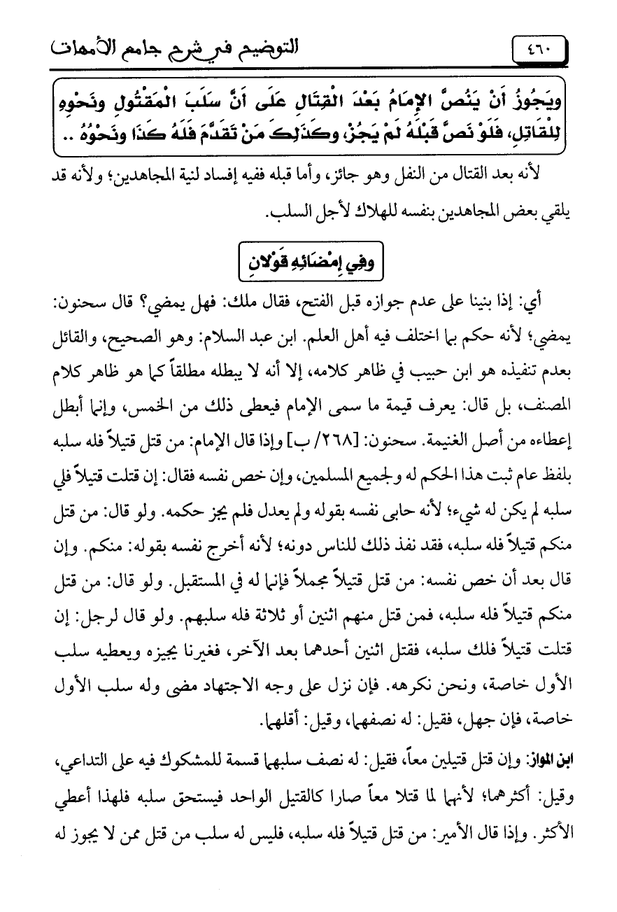 أي: إذا بنينا على عدم جوازه قبل الفتح، فقال ملك: فهل يمضي؟ قال سحنون: يمضي؛ لأنه حكم بما اختلف فيه أهل العلم. ابن عبد السلام: وهو الصحيح، والقائل بعدم تنفيذه هو ابن حبيب في ظاهر كلامه، إلا أنه لا يبطله مطلقاً كما هو ظاهر كلام المصنف، بل قال: يعرف قيمة ما سمي الإمام فيعطي ذلك من الخمس، وإنما أبطل إعطاءه من أصل الغنيمة. سحنون: [268/ ب] وإذا قال الإمام: من قتل قتيلاً فله سلبه بلفظ عام ثبت هذا الحكم له ولجميع المسلمين، وإن خص نفسه فقال: إن قتلت قتيلاً فلي سلبه لم يكن له شيء؛ لأنه حابى نفسه بقوله ولم يعدل فلم يجز حكمه. ولو قال: من قتل منكم قتيلاً فله سلبه، فقد نفذ ذلك للناس دونه؛ لأنه أخرج نفسه بقوله: منكم. وإن قال بعد أنخص نفسه: من قتل قتيلاً مجملاً فإنما له في المستقبل. ولو قال: من قتل منكم قتيلاً فله سلبه، فمن قتل منهم اثنين أو ثلاثة فله سلبهم. ولو قال لرجل: إن قتلت قتيلاً فلك سلبه، فقتل اثنين أحدهما بعد الآخر، فغيرنا يجيزه ويعطيه سلب الأول خاصة، ونحن نكرهه. فإن نزل على وجه الاجتهاد مضى وله سلب الأول خاصة، فإن جهل، فقيل: له نصفهما، وقيل: أقلهما.
