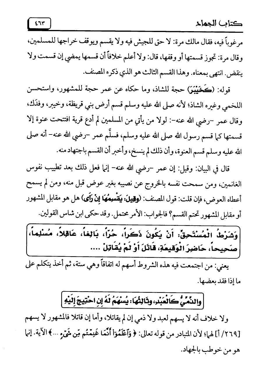 وَشَرْطُ الْمُسْتَحِقِّ: أَنْ يَكُونَ ذَكَراً، حُرّاً، بَالِغاً، عَاقِلاً، مُسْلِماً، صَحِيحاً، حَاضِرَ الْوَقيعَةِ، قَاتَلَ أَوْ لَمْ يُقَاتِلْ .....